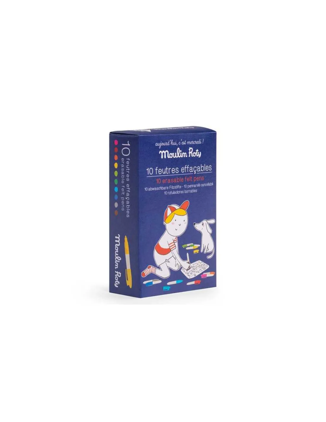 Découvrez le set de 10 feutres effaçable Super Petit de la collection Aujourd’hui c’est Mercredi de Moulin Roty, une boite de 10 feutres effaçables pour dessiner ou colorier sur votre set en silicone Super Petit.