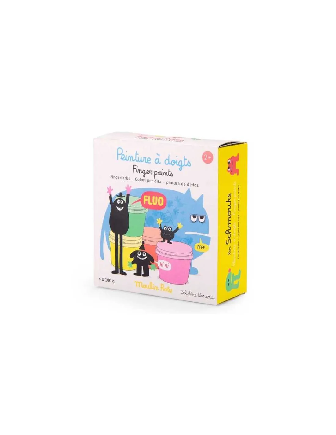 Découvrez les 4 pots de peinture à doigts fluo de la collection Les Schmouks de Moulin Roty, 4 pots de peinture à doigts fluo pour laisser libre court à la créativité des petits à partir de 2 ans!