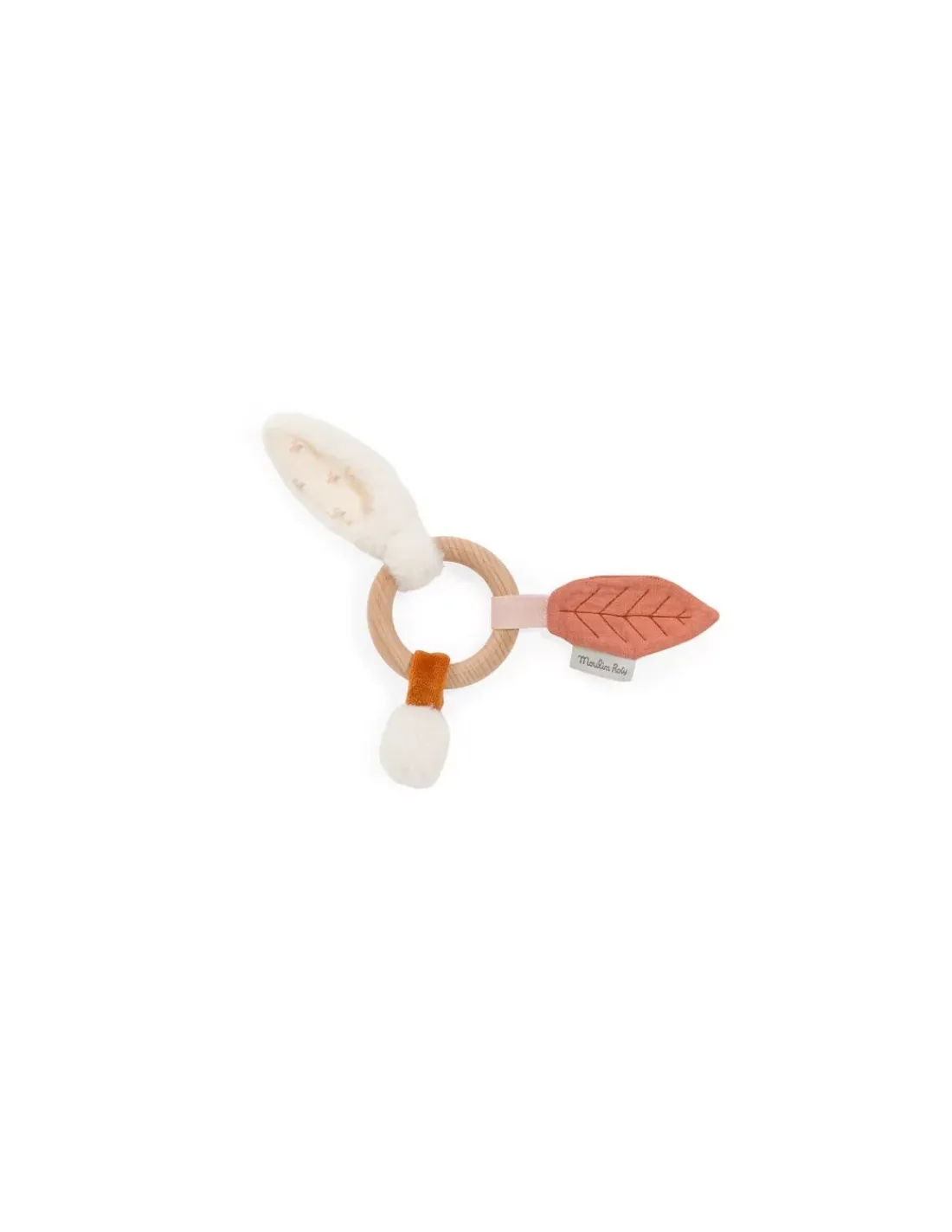Découvrez l’anneau hochet bois lapin de la collection Après la pluie de Moulin Roty, un anneau rond en bois naturel, sur lequel sont cousus une feuille, une oreille et une queue de lapin en fourrure avec quelques surprises… Du papier bruissant et des grelots pour éveiller bébé durant les balades.