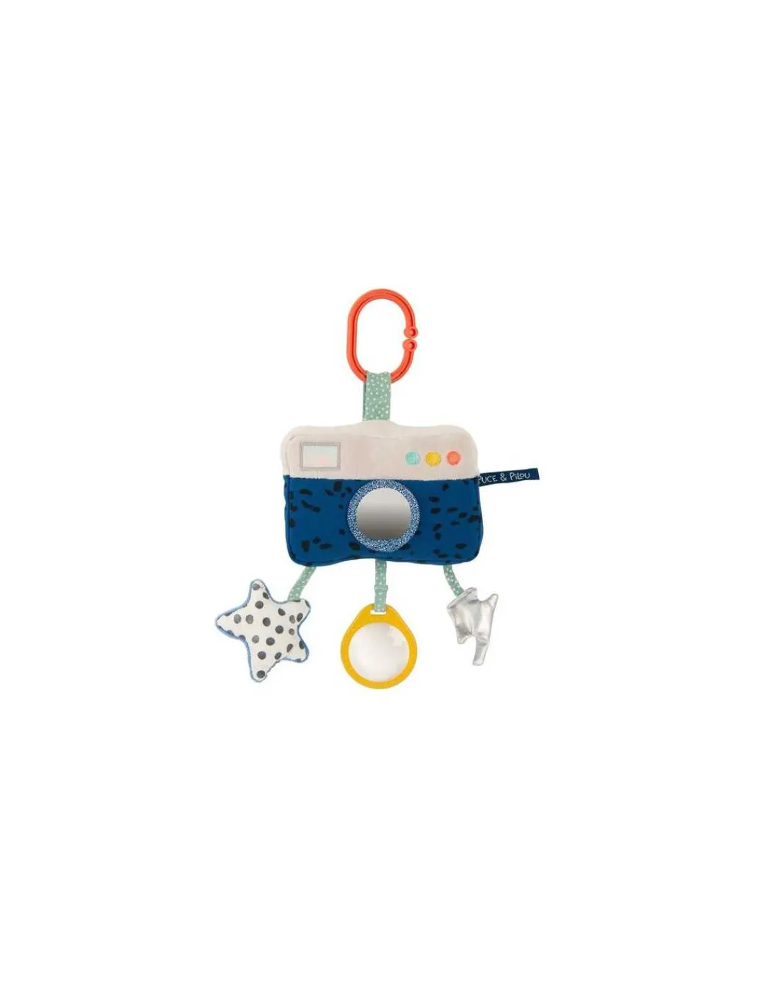 Appareil photo à suspendre plein de surprises ! Des rubans à attraper, un miroir pour s’observer ou encore des grelots à secouer pour se dandiner.