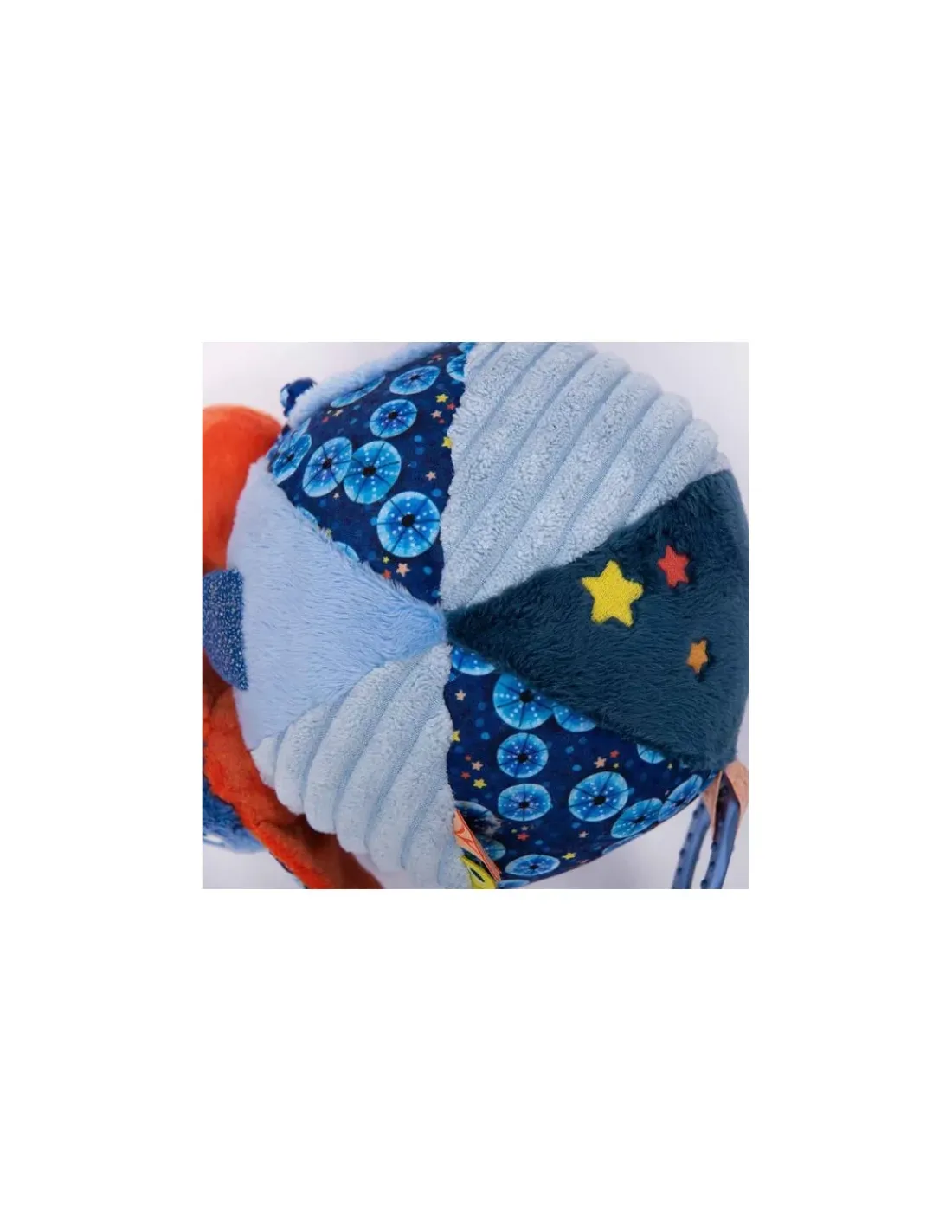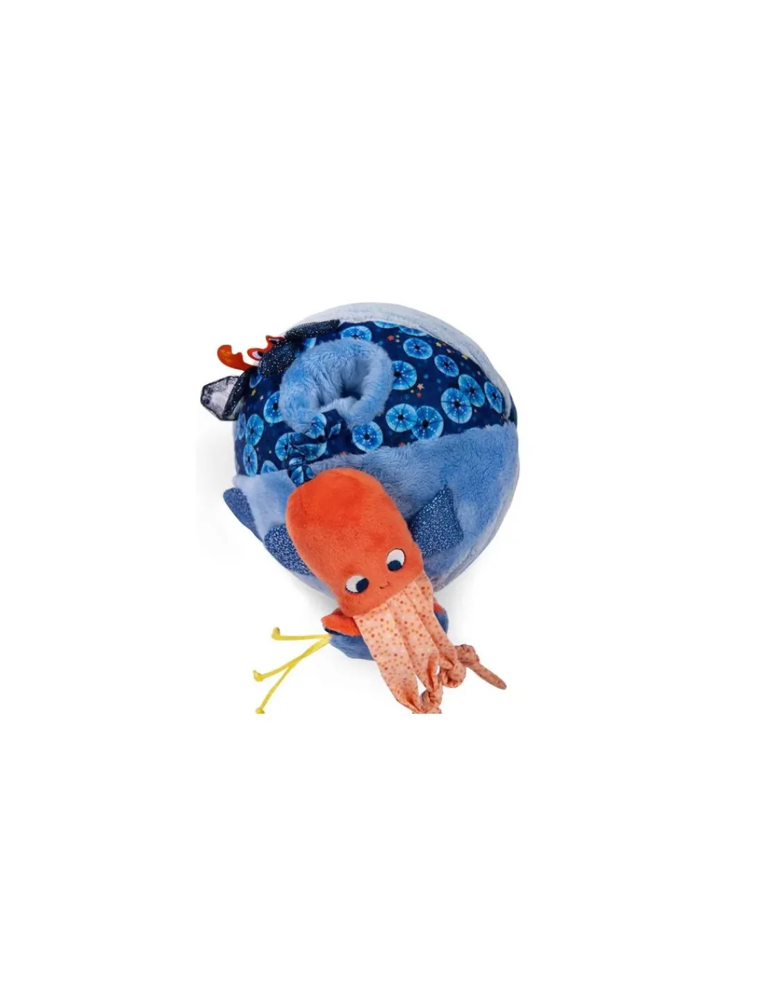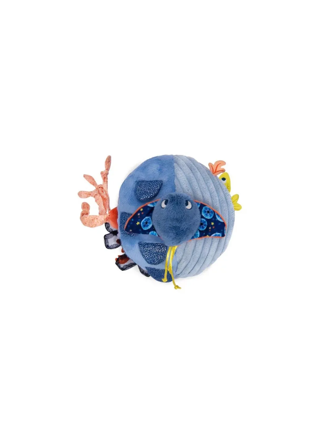 Cette balle hochet regorge de gris-gris colorés sur ses 6 faces. On y trouve algues et écailles pailletées, un poulpe caché, une raie délicatement posée… Mais aussi de quoi se soulager la poussée dentaire avec un anneau à mâchouiller!