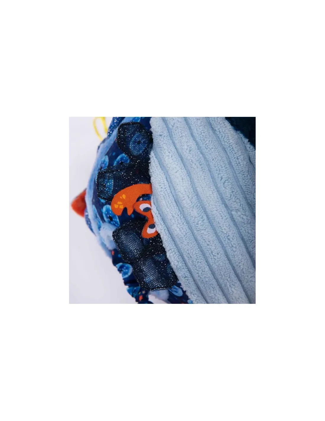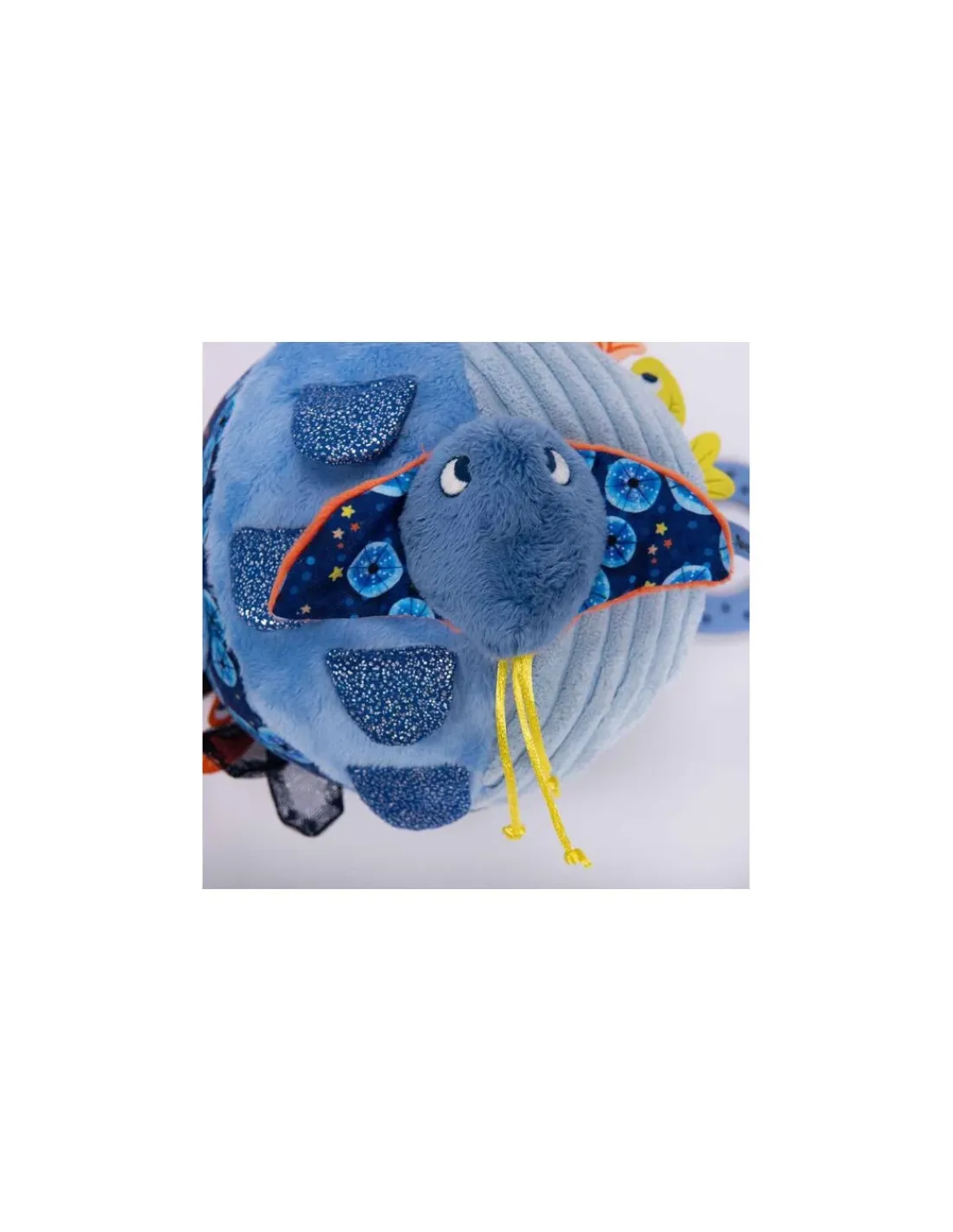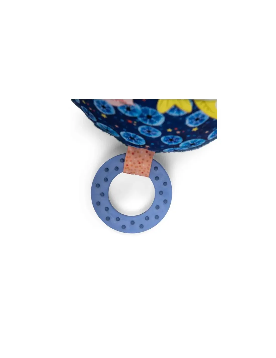 Cette balle hochet regorge de gris-gris colorés sur ses 6 faces. On y trouve algues et écailles pailletées, un poulpe caché, une raie délicatement posée… Mais aussi de quoi se soulager la poussée dentaire avec un anneau à mâchouiller!