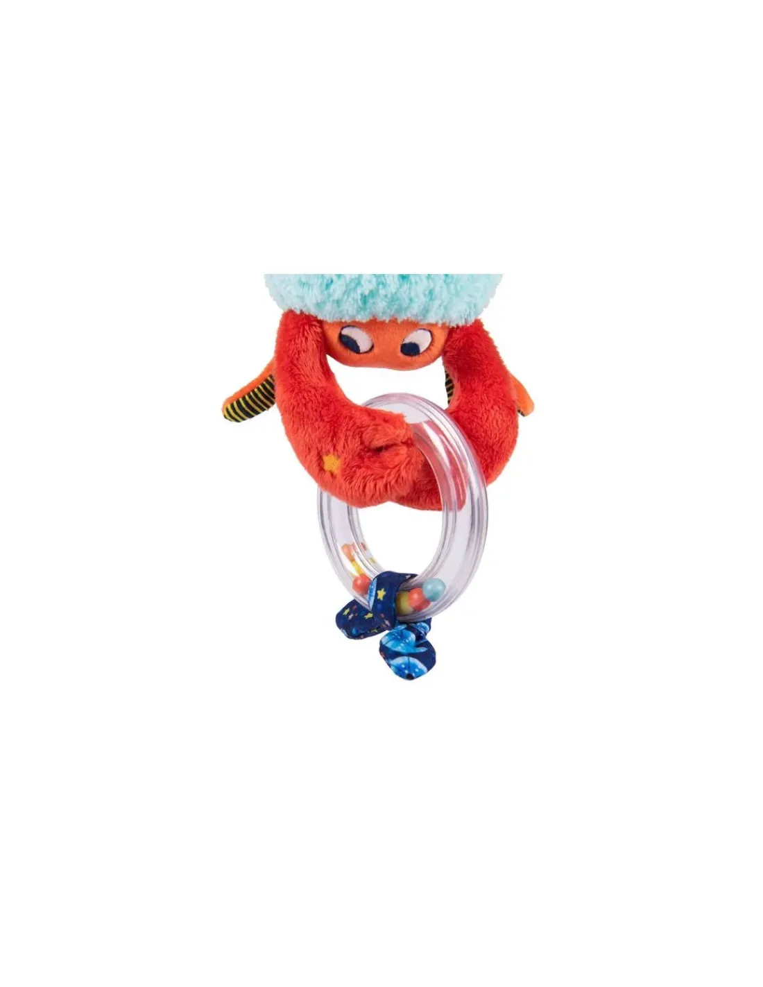À suspendre à la poussette, à une arche d’activités ou au parc de votre enfant, ce drôle de crustacé en tissu aux motifs colorés propose plein d’activités : anneau à billes, étiquettes à attraper, clochette qui fait glong… Votre enfant s’émerveillera devant les différents sons lorsqu’il secouera le hochet et que les billes glisseront dans l’anneau. Un jouet qui peut être complété par d’autres petites activités nomades de la collection.