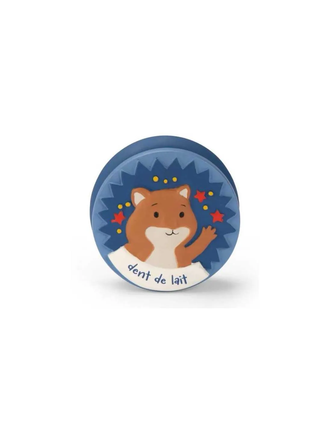 Une délicate boîte à dents de lait en résine, aux couleurs de la gamme, avec en volume le portrait de cacahuète le hamster de la collection qui gardera précieusement les premières quenottes de bébé.