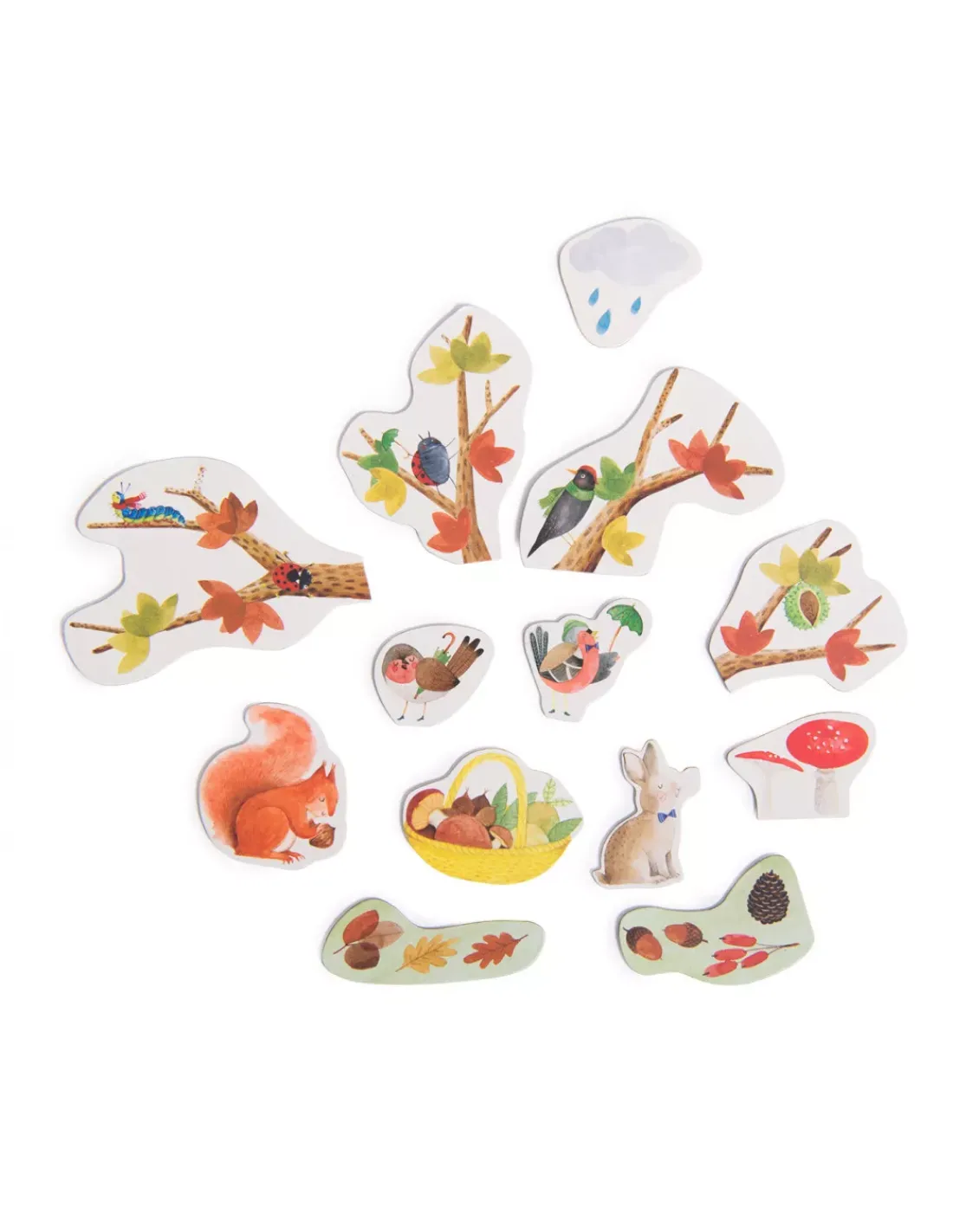 Un grand calendrier comprenant plus de 100 magnets pour se repérer dans le temps et apprendre les saisons, en habillant l’arbre illustré au fil de l’année. Il comprend aussi 4 enveloppes pour ranger chaque saison.