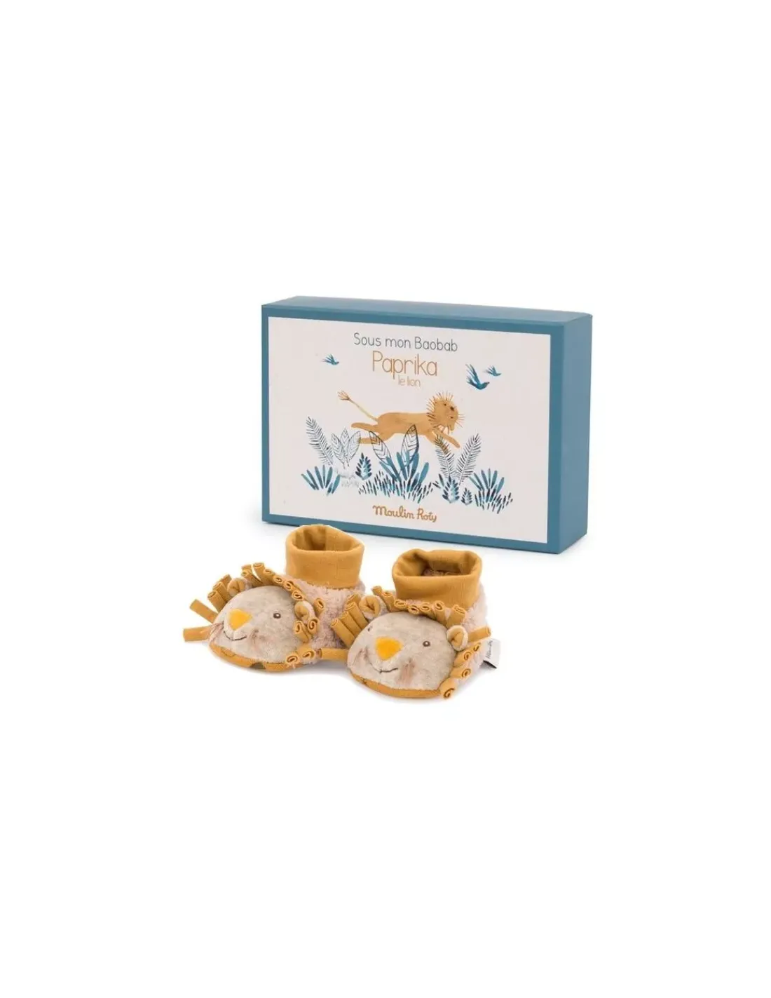 Découvrez les chaussons lion de la collection Sous mon baobab de Moulin Roty, de jolis chaussons naissance en velours éponge chiné et fourrure beige toute douce, avec un molleton pour la semelle. Paprika le lion s’invite aux pieds de votre bébé qui pourra aussi jouer avec la crinière et la moustache de cet adorable lion.