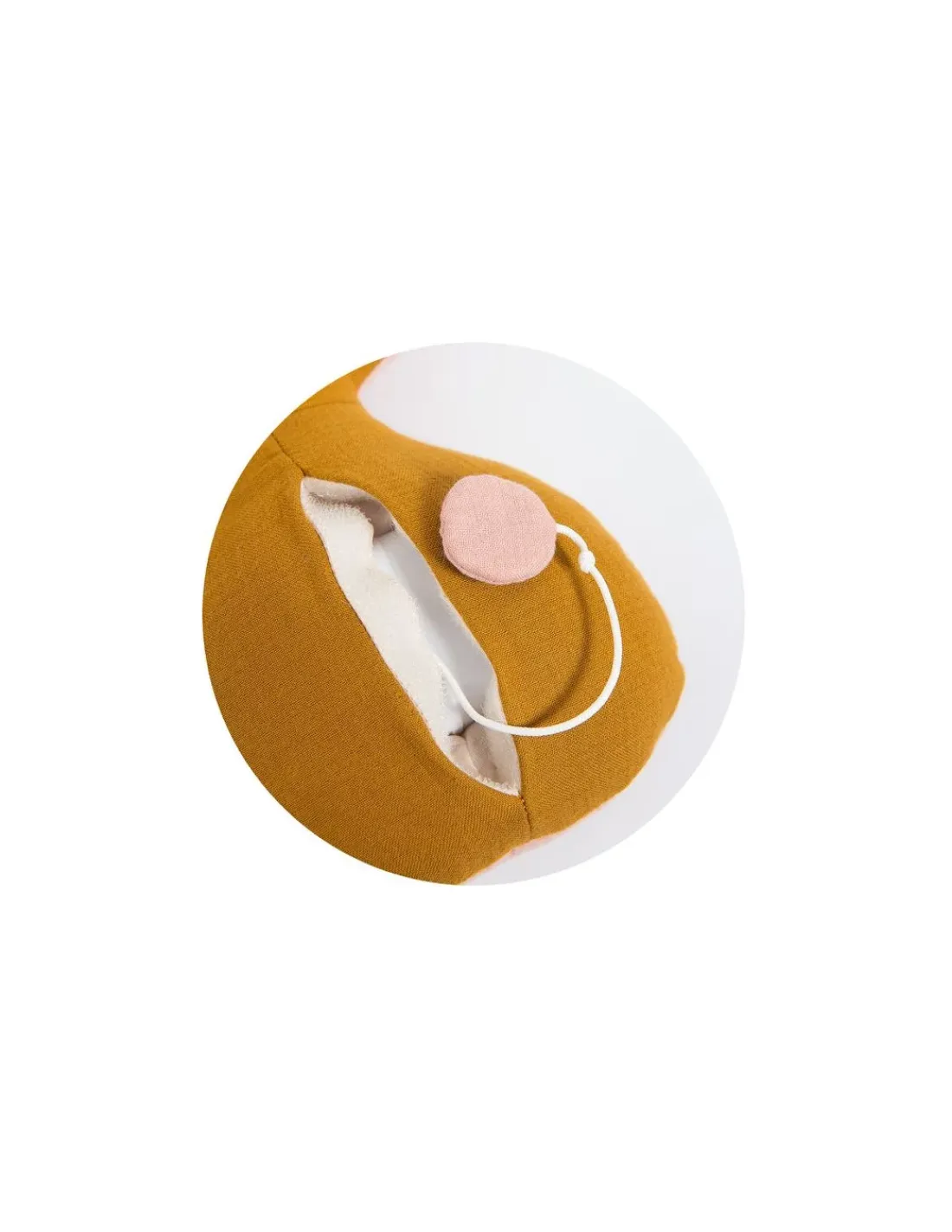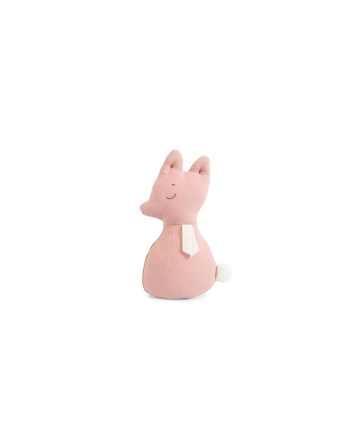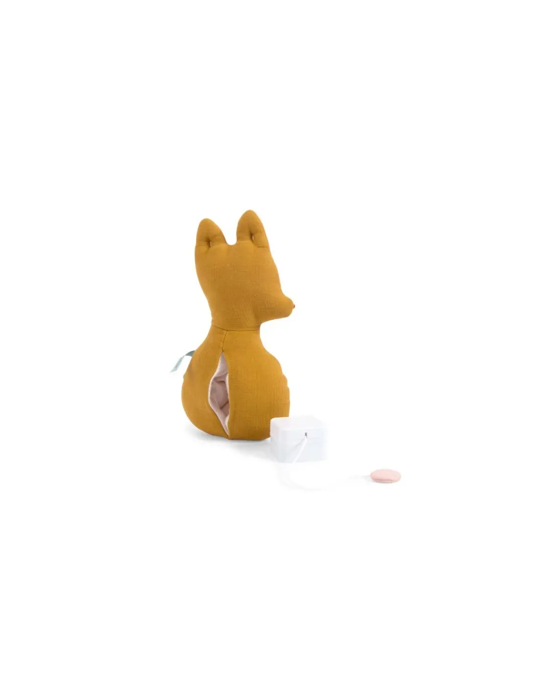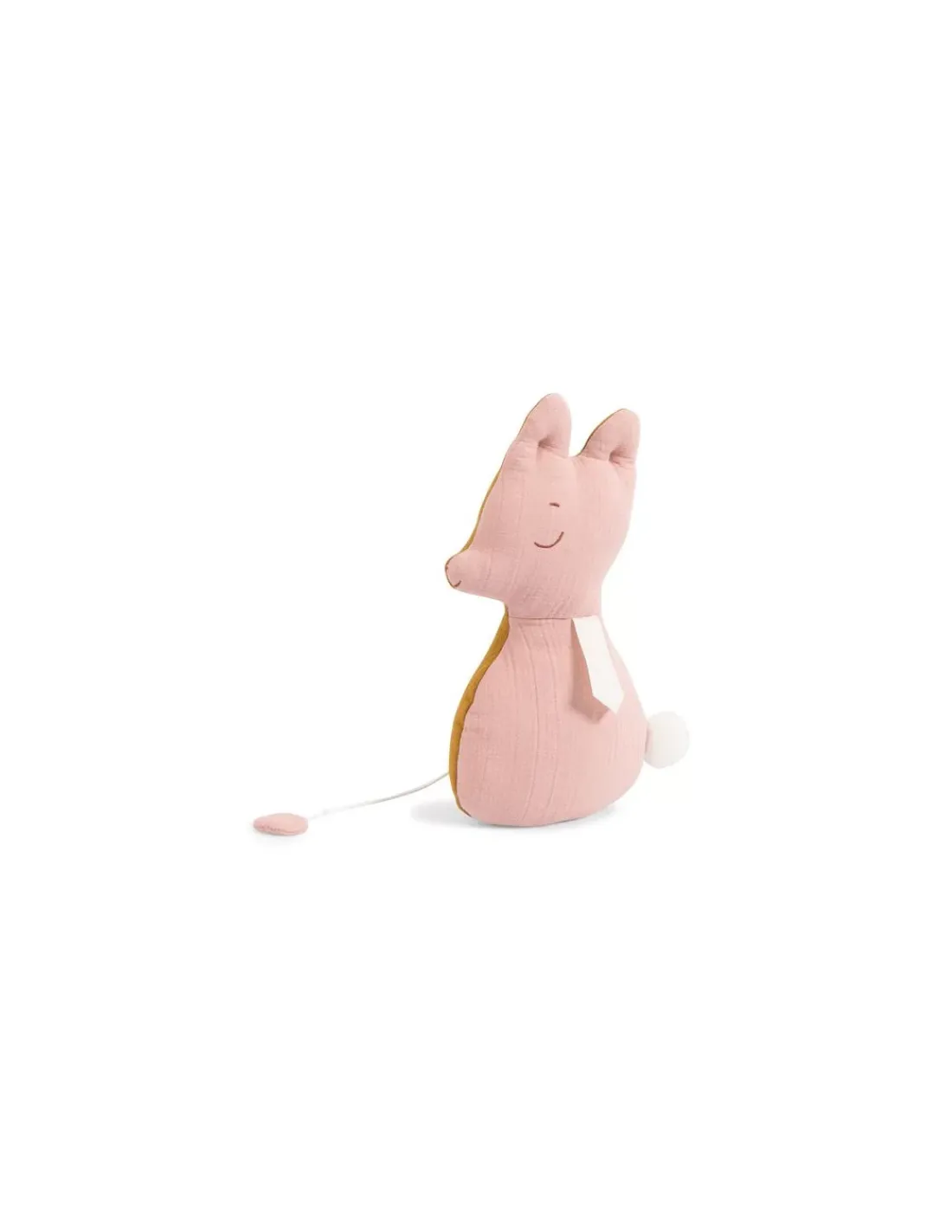 Lange rose d’un côté, et lange moutarde de l’autre, il est brodé et cousu d’une petite queue en fourrure. La boîte à musique s’enlève pour pouvoir le passer en machine.