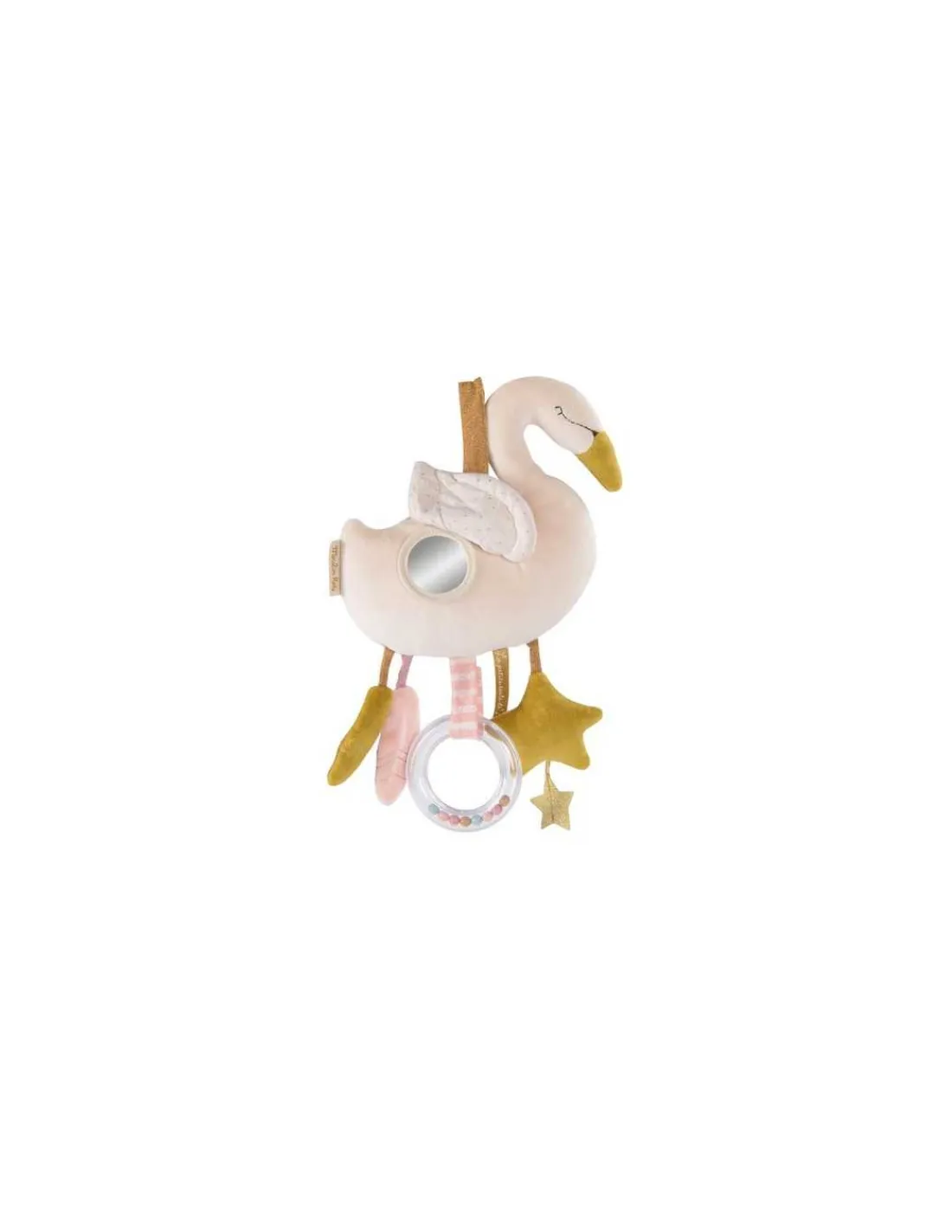 Grâce à sa languette velcro, le cygne en velours tout doux peut être suspendu partout. Il transporte avec lui plein de surprises pour amuser bébé, annneau à billes, pouët et scritch qui font du bruit. Il y a même un miroir caché sous sous aile!