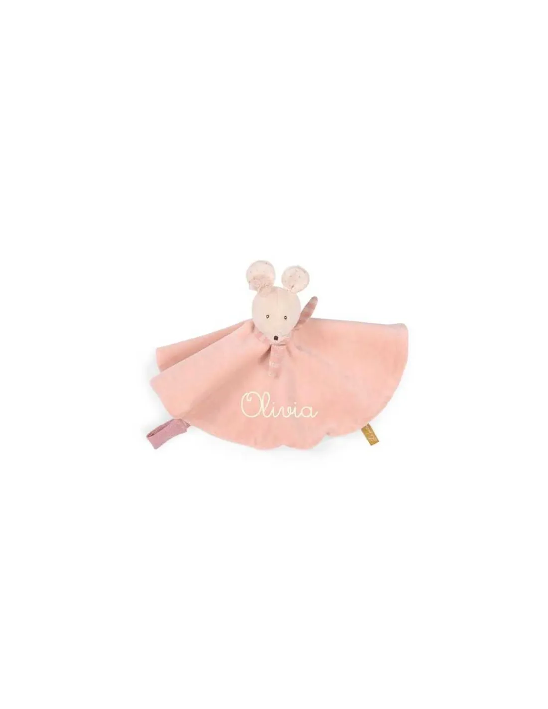Un doudou souris au doux visage brodé pour accompagner bébé. En éponge velours rose poudré et crème avec attache-tétine. Plat et rond, il est facile à saisir par les petits mains. Peut être brodé à son prénom pour le rendre encore plus unique.