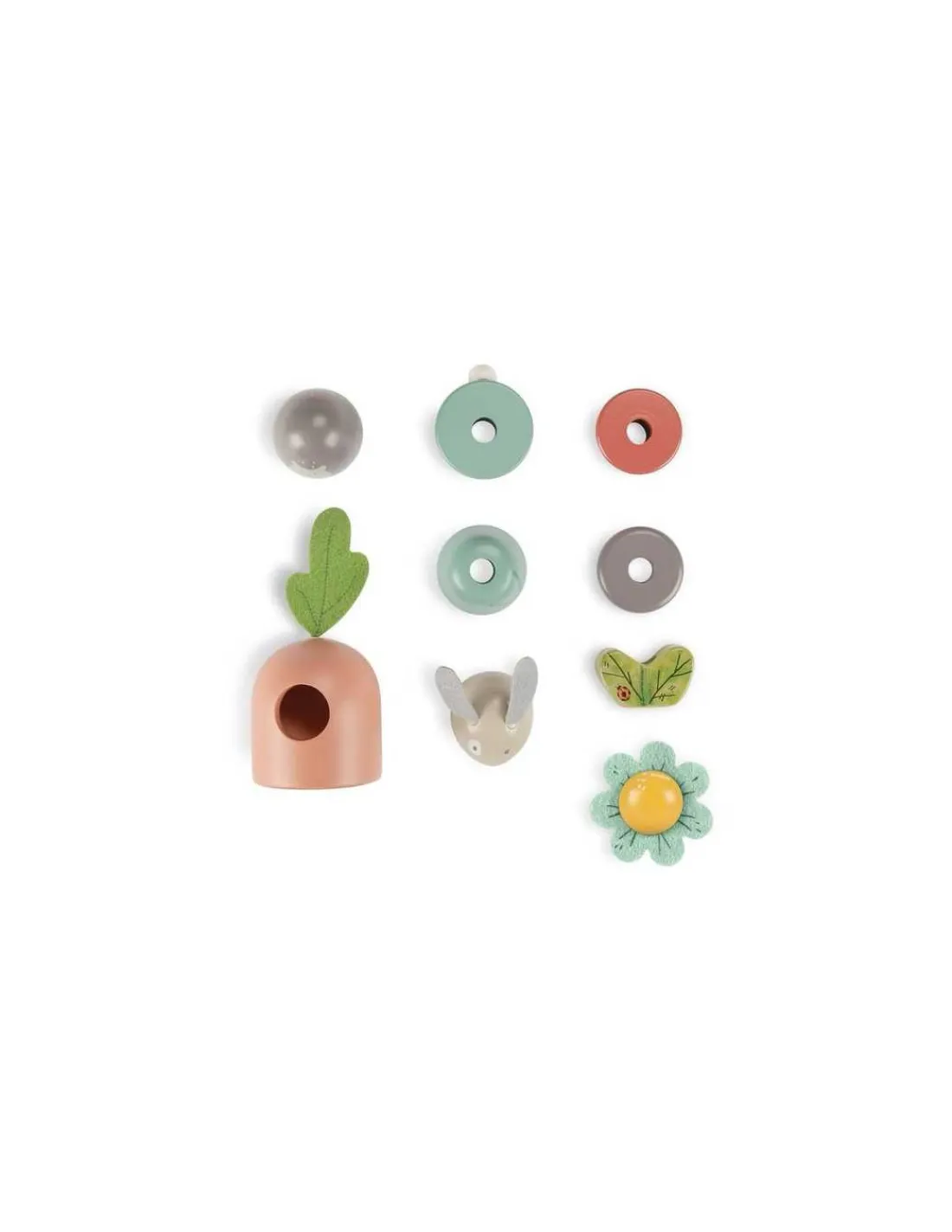 Découvrez le jeu Empilable multi-activités de la collection Trois petits lapins de Moulin Roty, un jouet d’éveil en bois très élégant pour les enfants à partir de 1 an.