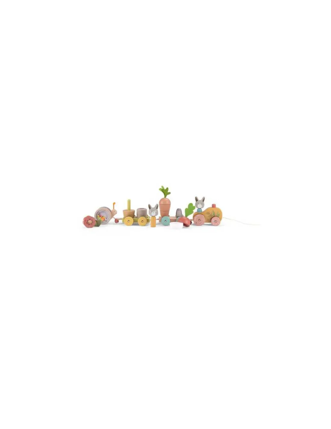Découvrez le grand train d’activités à tirer de la collection Trois petits lapins de Moulin Roty, un jouet d’éveil en bois que votre bébé va s’amuser à promener dans toute la maison dès ses premiers pas.