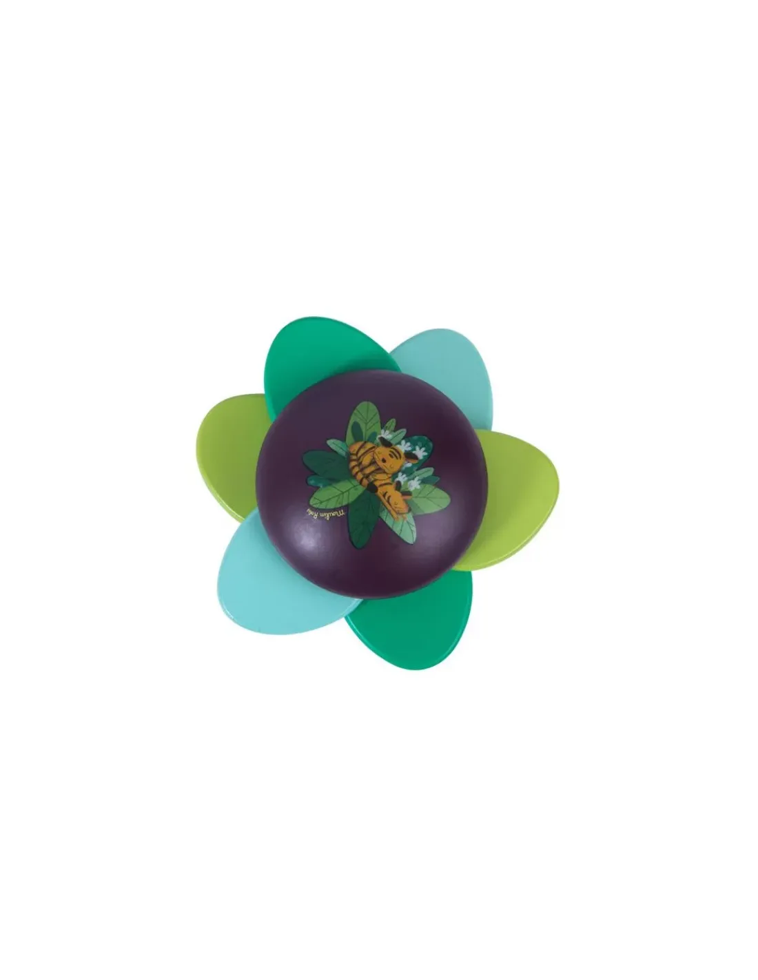 Un hochet en bois avec de jolies feuilles vertes au milieu desquelles se cache un grelot. Un petit instrument facile à attraper et à secouer par de petites mains.