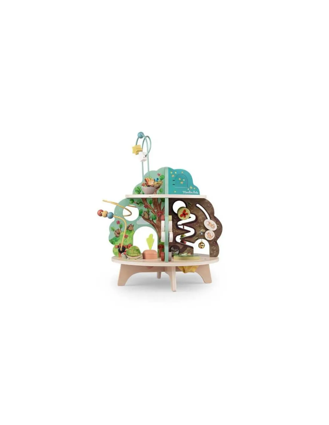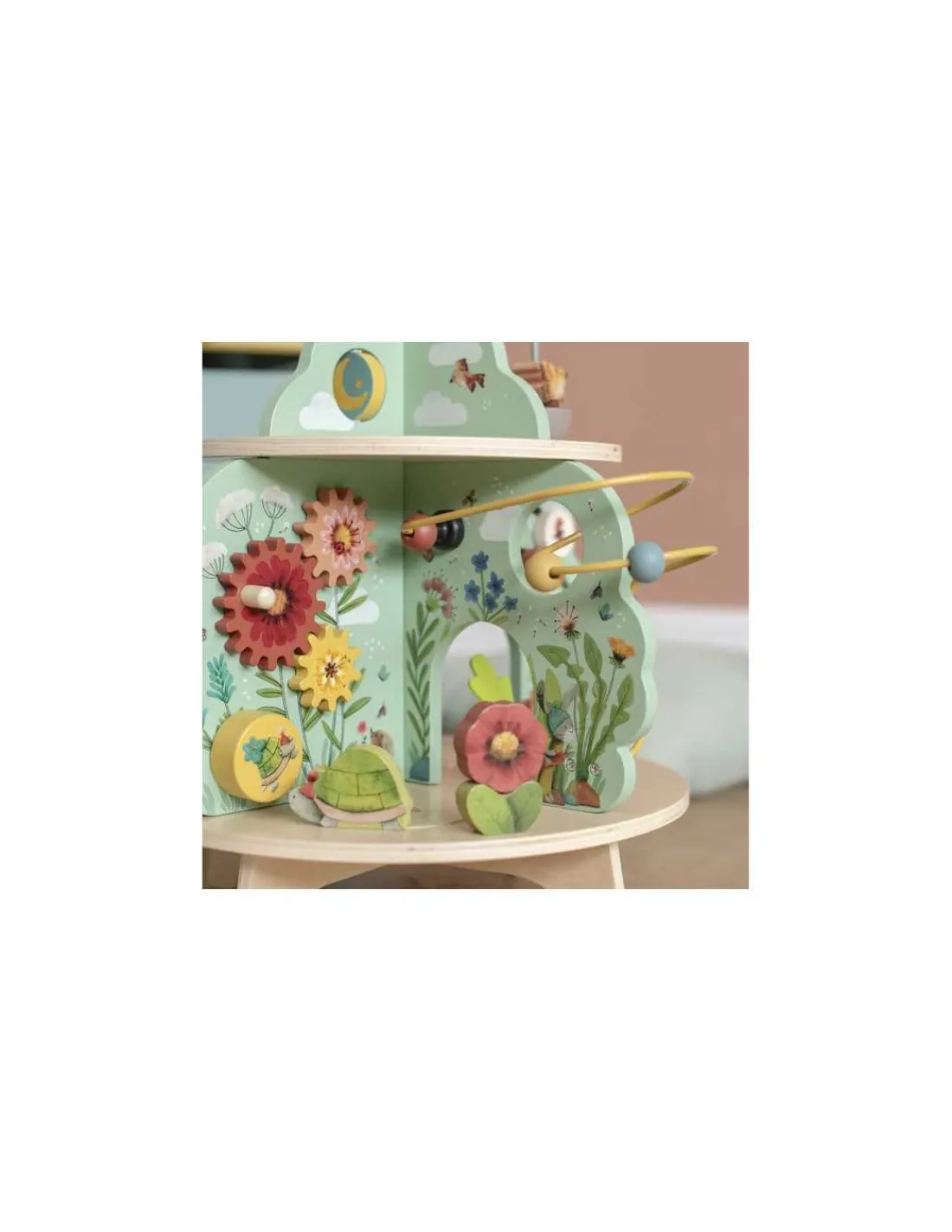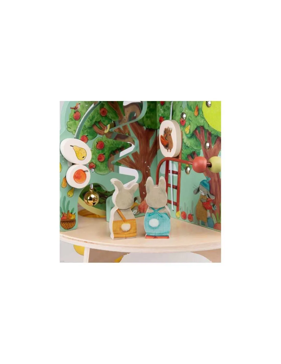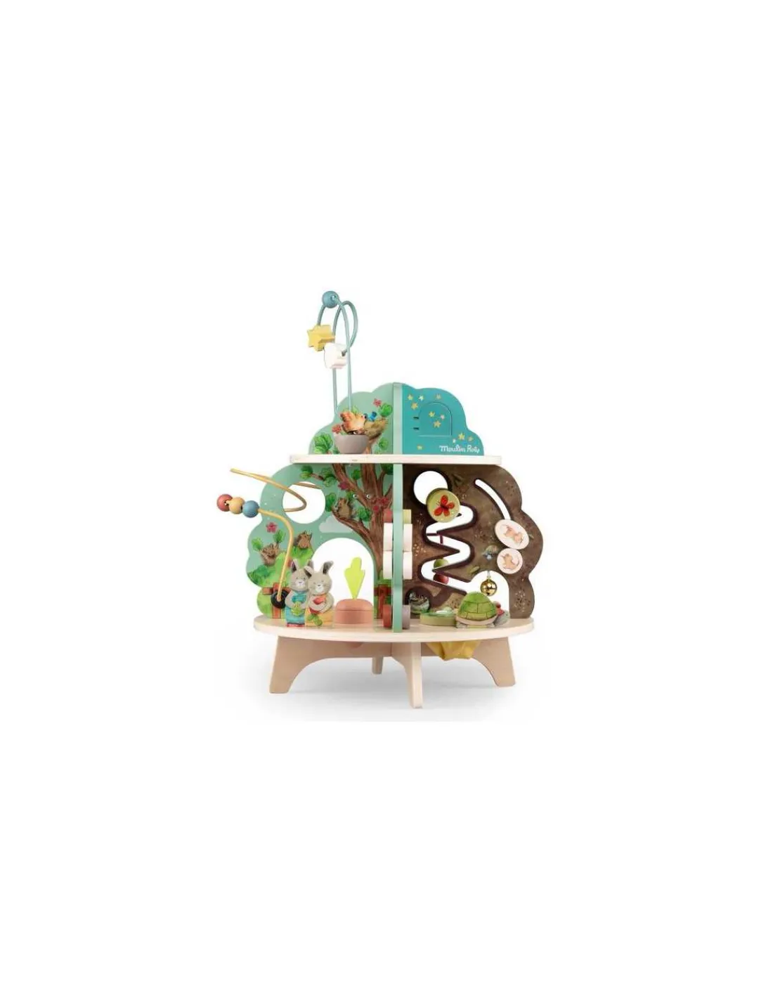 Découvrez le Jardin multi-activités de la collection Trois petits lapins de Moulin Roty, un jouet d’éveil en bois aux couleurs du jardin pour amuser les enfants dès 12 mois.