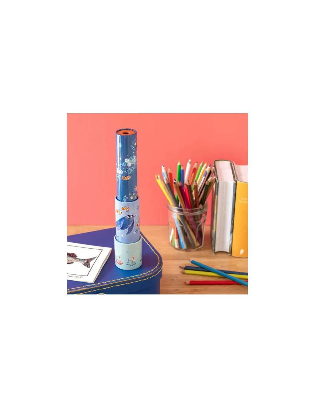 Découvrez le kaléidoscope longue-vue de la collection Les aventures de Paulie de Moulin Roty, un beau jouet en métal remis au goût du jour avec de belles illustrations sur le thème de la mer.