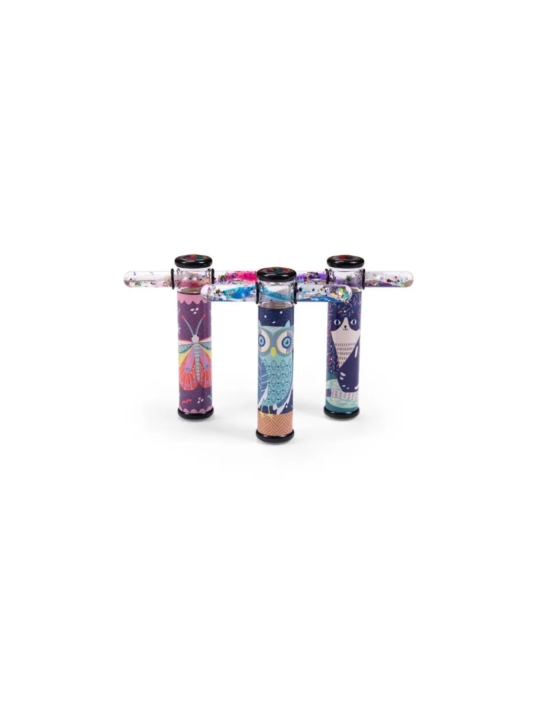 Découvrez le kaleidoscope pailettes phosphorescent chouette de la collection Les petites merveilles de Moulin Roty, un kaleidoscope et 1 tubes de paillettes et d’étoiles pour regarder les milles couleurs.