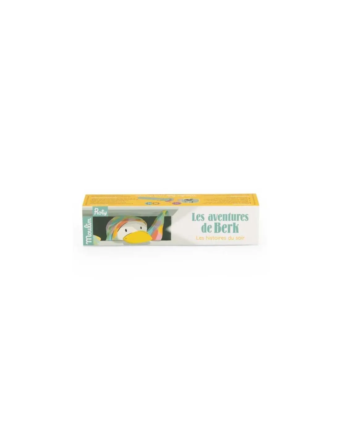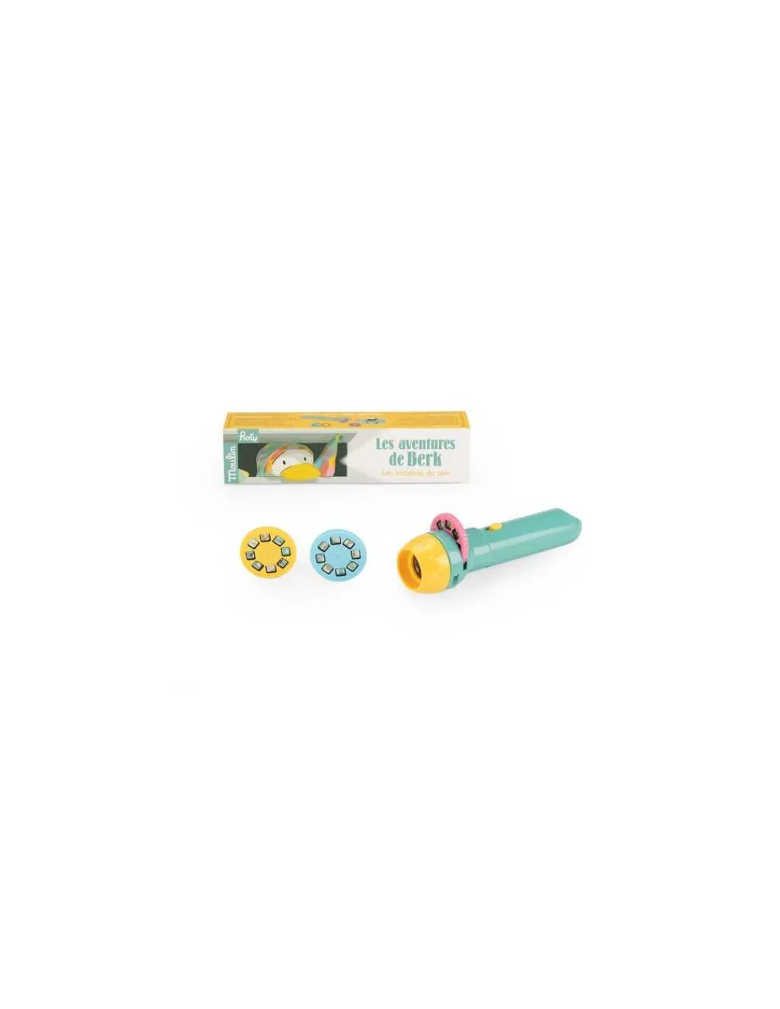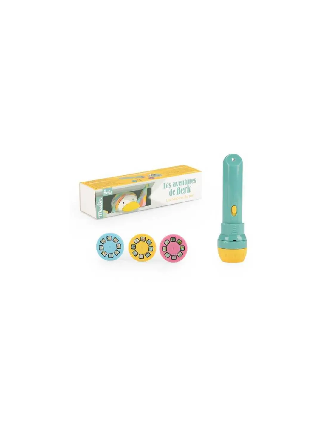 Découvrez la lampe à histoires Berk Ecole des loisirs de Moulin Roty, une lampe torche qui projette des images en couleurs pour raconter de jolies histoires à votre enfant. 3 disques, 3 histoires originales pour découvrir les aventures de Berk, le petit canard intrépide et maladroit.