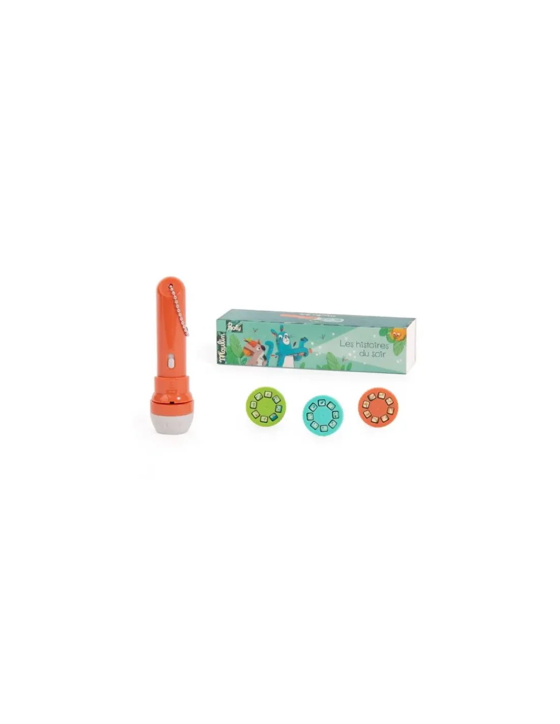 Découvrez la lampe à histoires de la collection Dans la jungle de Moulin Roty, une lampe torche qui projette des images en couleurs pour raconter de jolies histoires à votre enfant, 3 disques, 3 histoires originales qui vont vous emporter dans les aventures des personnages de la collection Dans la jungle. Un instant magique pour développer l’imagination des enfants…
