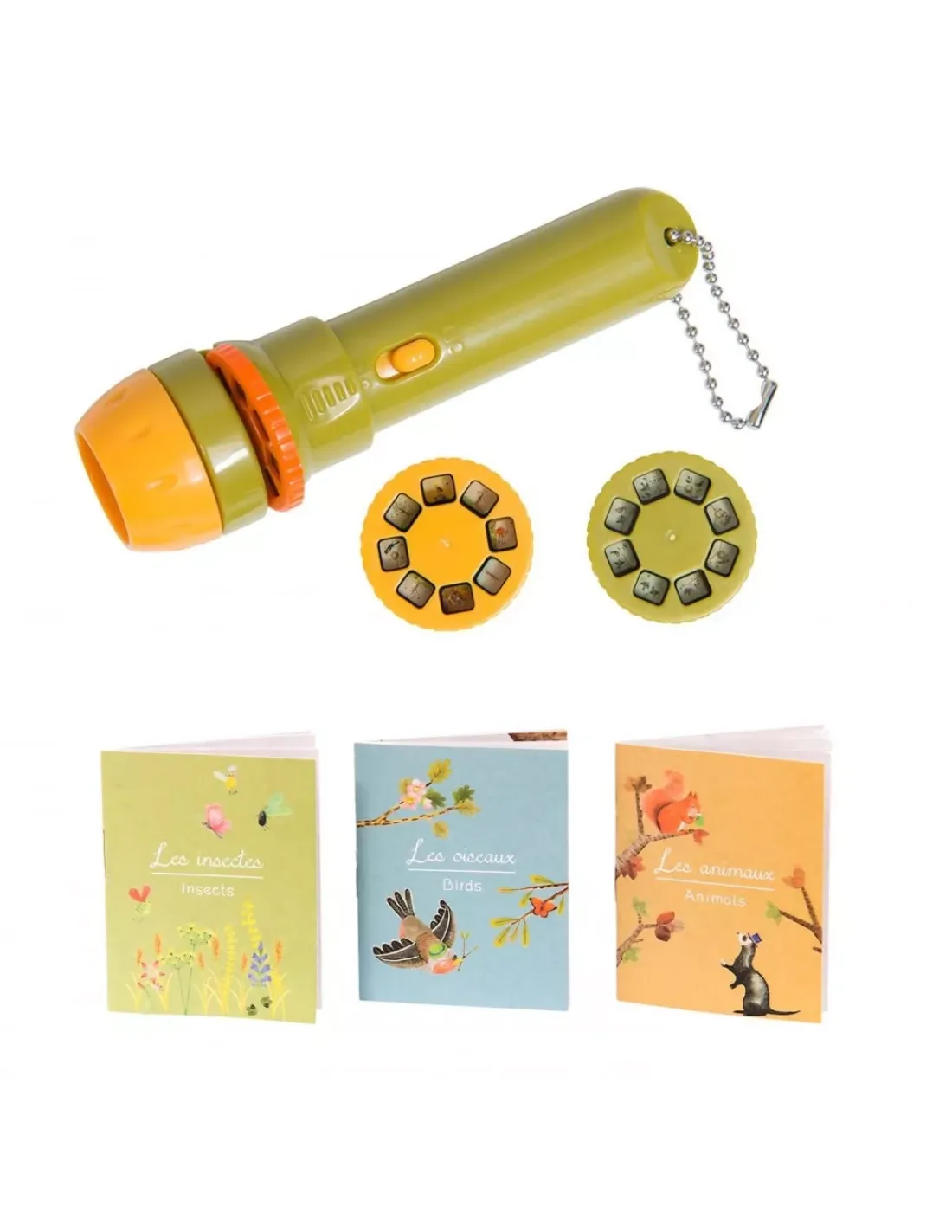 Lampe torche de poche où chacun des 3 disques projetés sur le mur raconte une histoire: les oiseaux font leur nid, la chenille devient papillon et les 4 saisons.