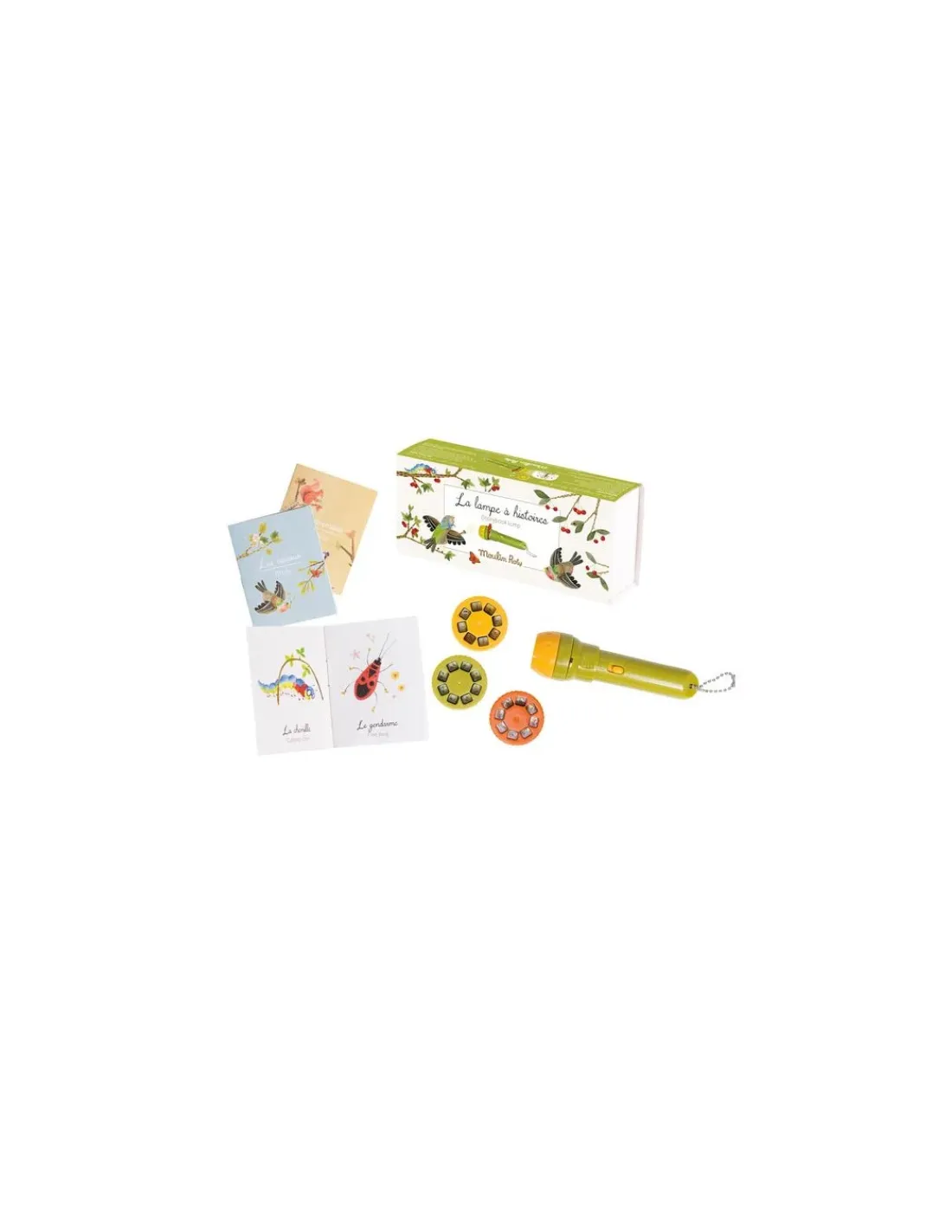 Découvrez la lampe à histoires et ses 3 mini livres de la collection Le jardin du moulin de Moulin Roty, une lampe torche qui projette des images en couleurs pour raconter de jolies histoires à votre enfant, 3 disques, 3 histoires originales sur le thème du jardin et 3 mini livres pour apprendre les animaux en images.