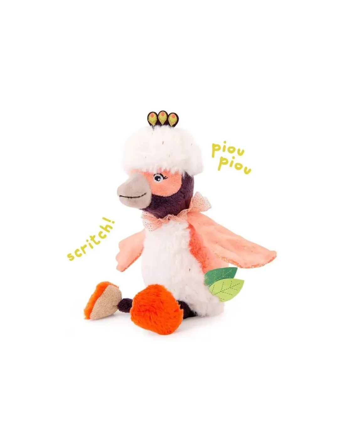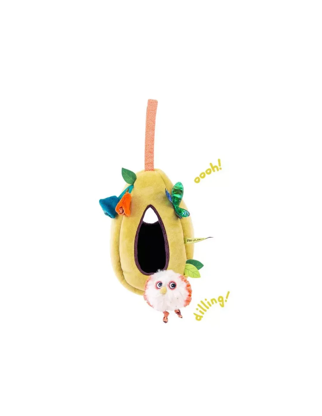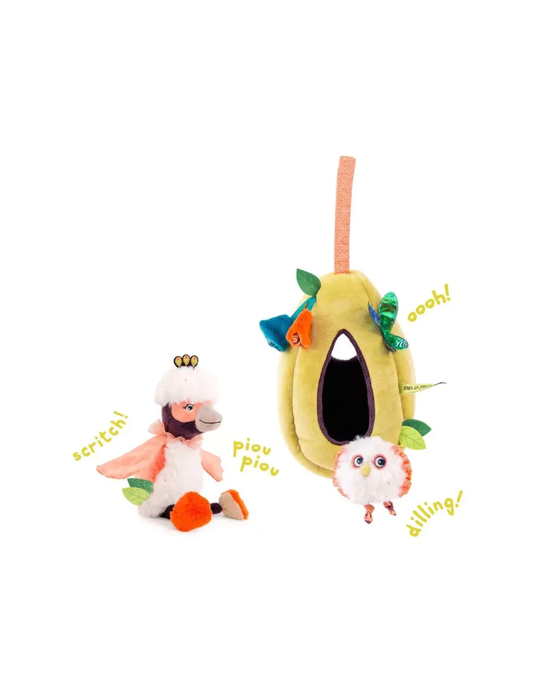 A suspendre à la poussette ou à une arche d’activités, ce joli jouet coloré est composé du nid et de Paloma l’oiseau, une peluche toute douce. Votre enfant s’amusera à mettre l’oiseau dans le nid, puis à le retirer. Il découvrira un joli bruit en appuyant sur le ventre de Paloma, ainsi que le son du papier crissant dans les ailes de l’animal.