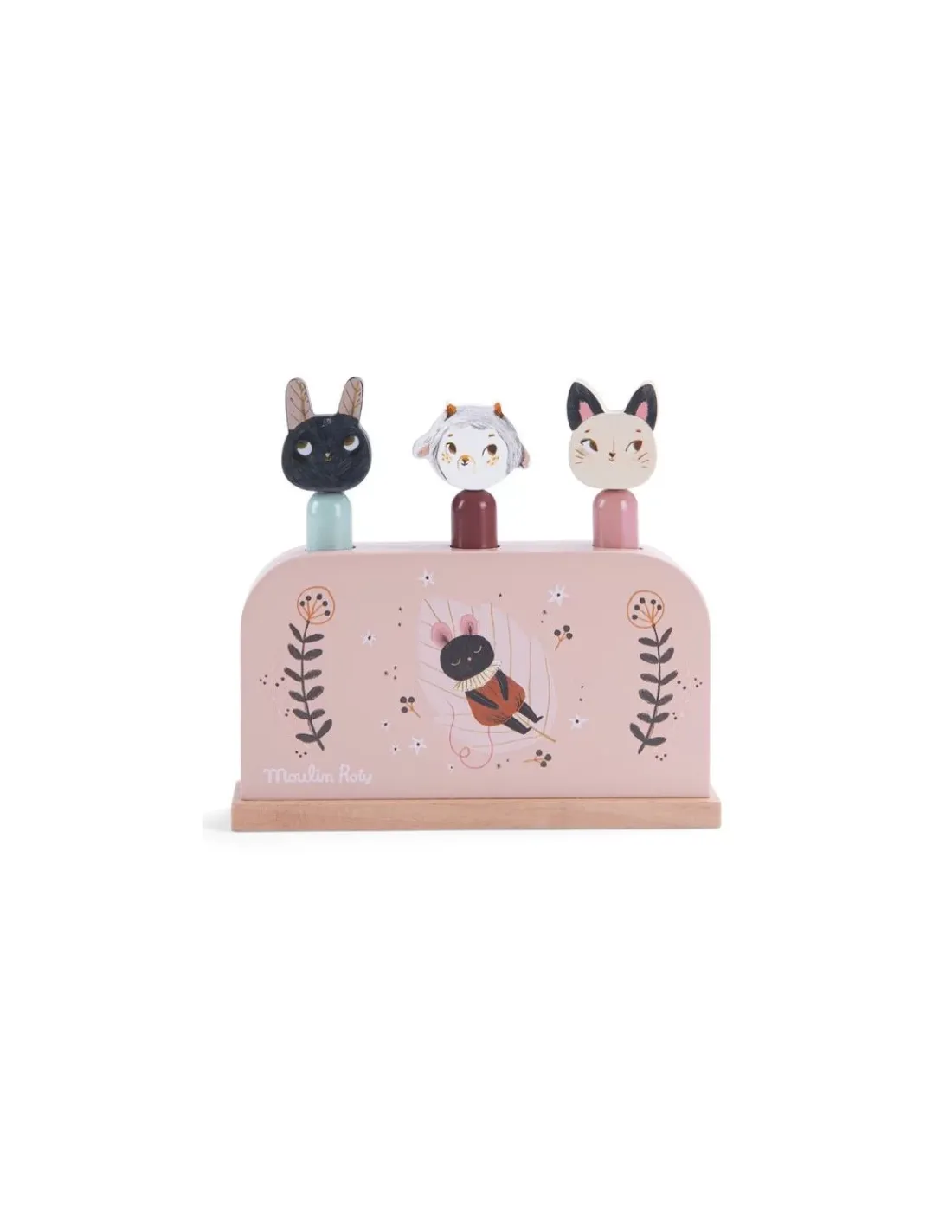 Ce magnifique pop-up en bois est composé d’un socle et de 3 personnages de la collection Après la Pluie, prêts à sauter partout! Un adorable jeu d’éveil qui consiste à appuyer sur la tête pour voir le personnage sauter et sortir de sa cachette.