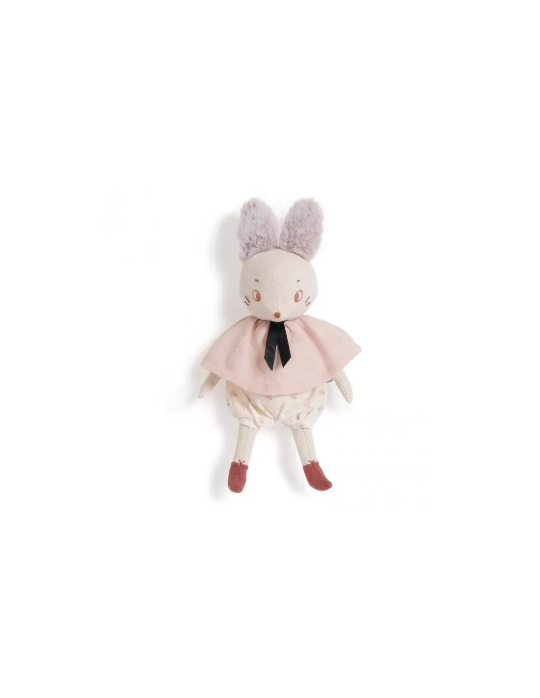 Ce doudou souris Brume en jersey et tissu chambray crème, avec ses grandes oreilles toutes douces, est vêtue d’un panty à fleurs et d’une blouse rose en lin avec, autour de son cou, un nœud en ruban noir.