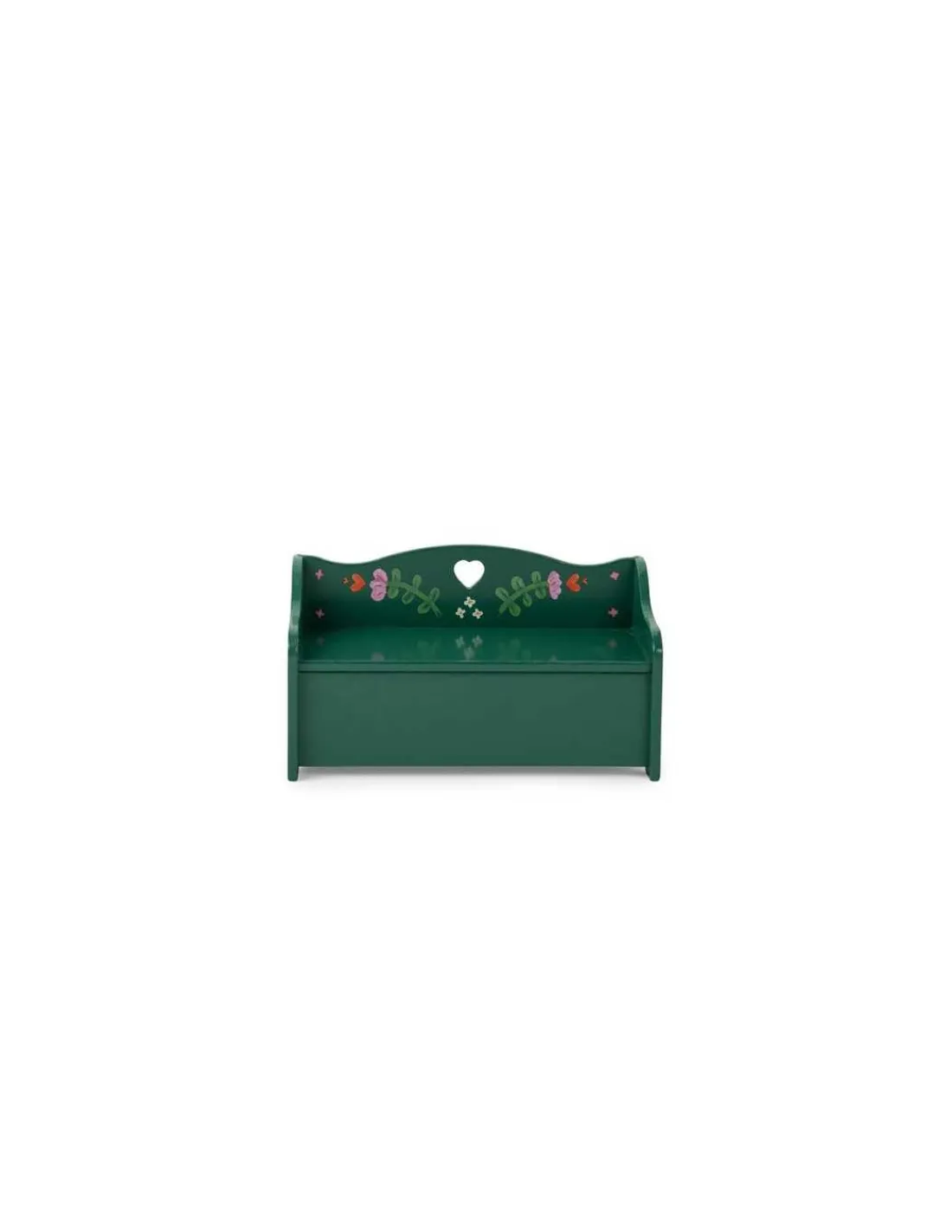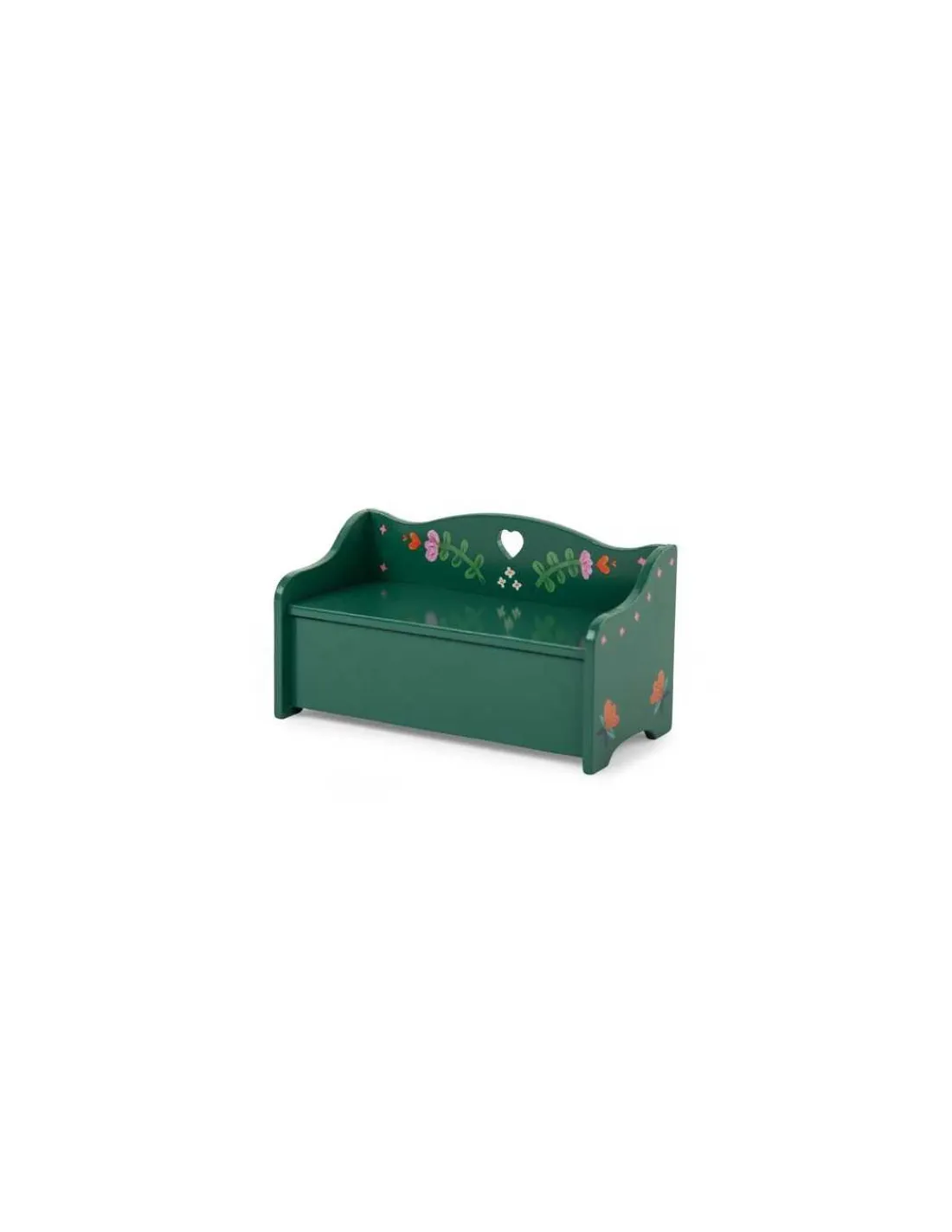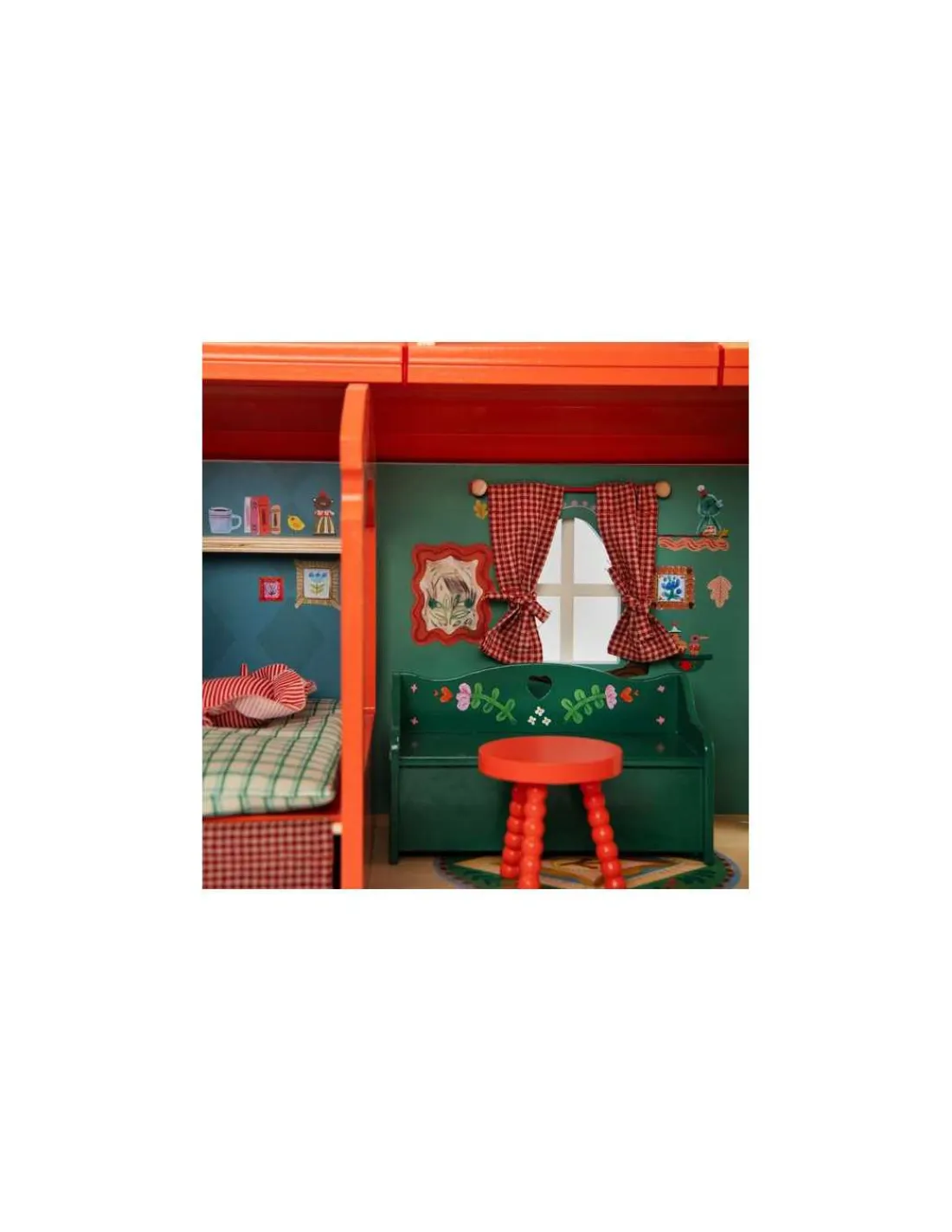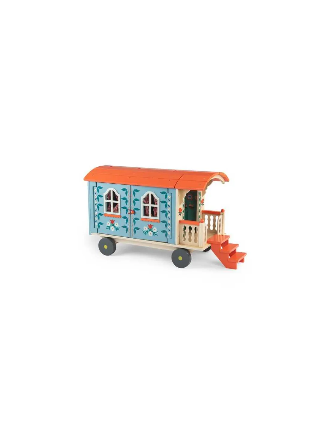 Une grande roulotte avec toit amovible et jolis détails fleuris qui comprend un banc, un lit, un guéridon, un escalier ainsi que des rideaux, un coussin et un édredon en tissu. Personnages vendus séparément.