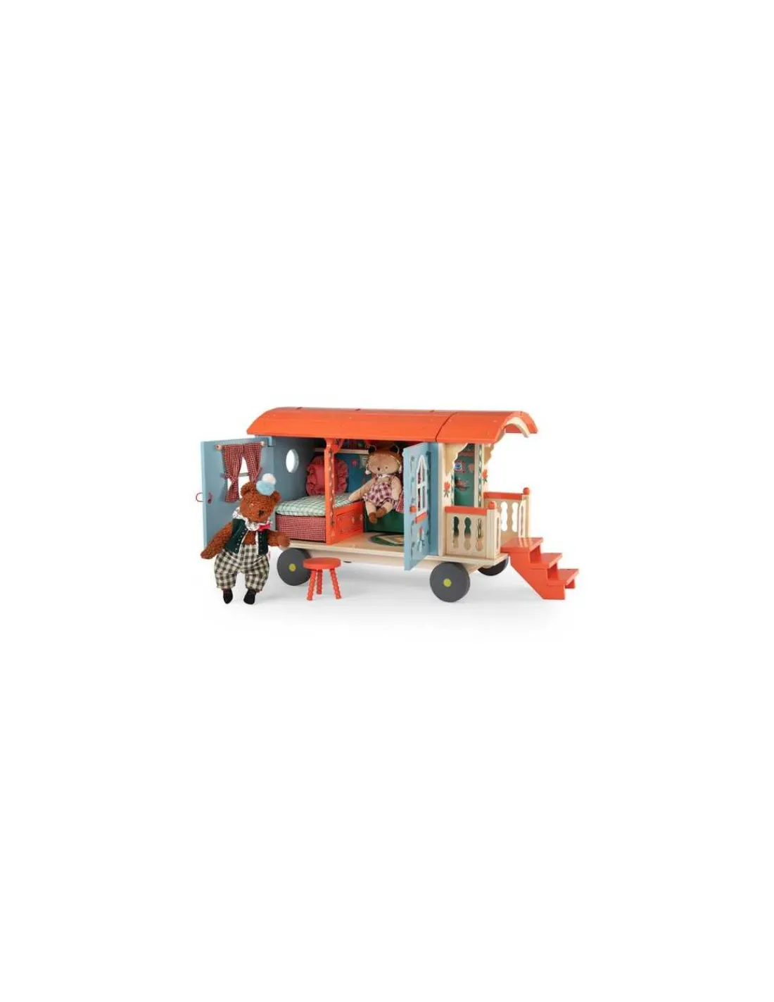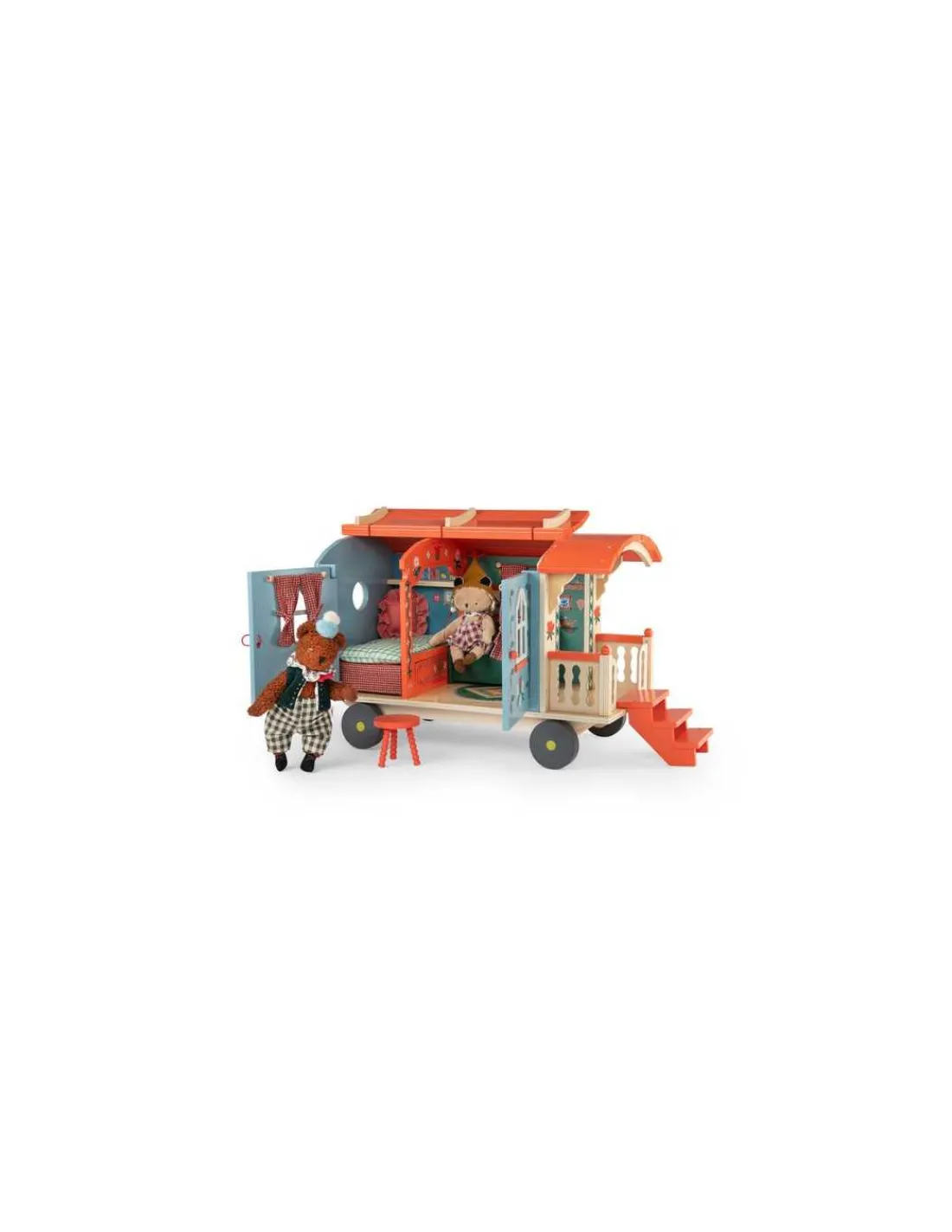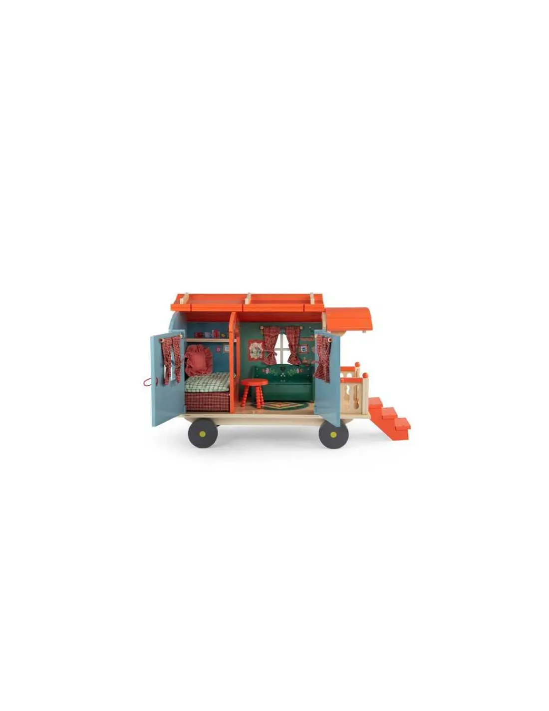 Découvrez la Roulotte en bois de la collection Les Minouchkas de Moulin Roty, une maison de poupée roulotte pour se raconter de belles histoires avec les poupées articulées Minouchkas à partir de 3 ans.