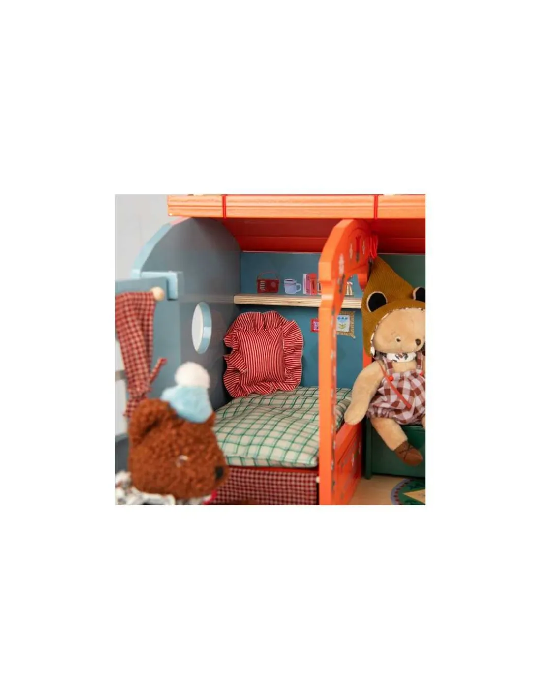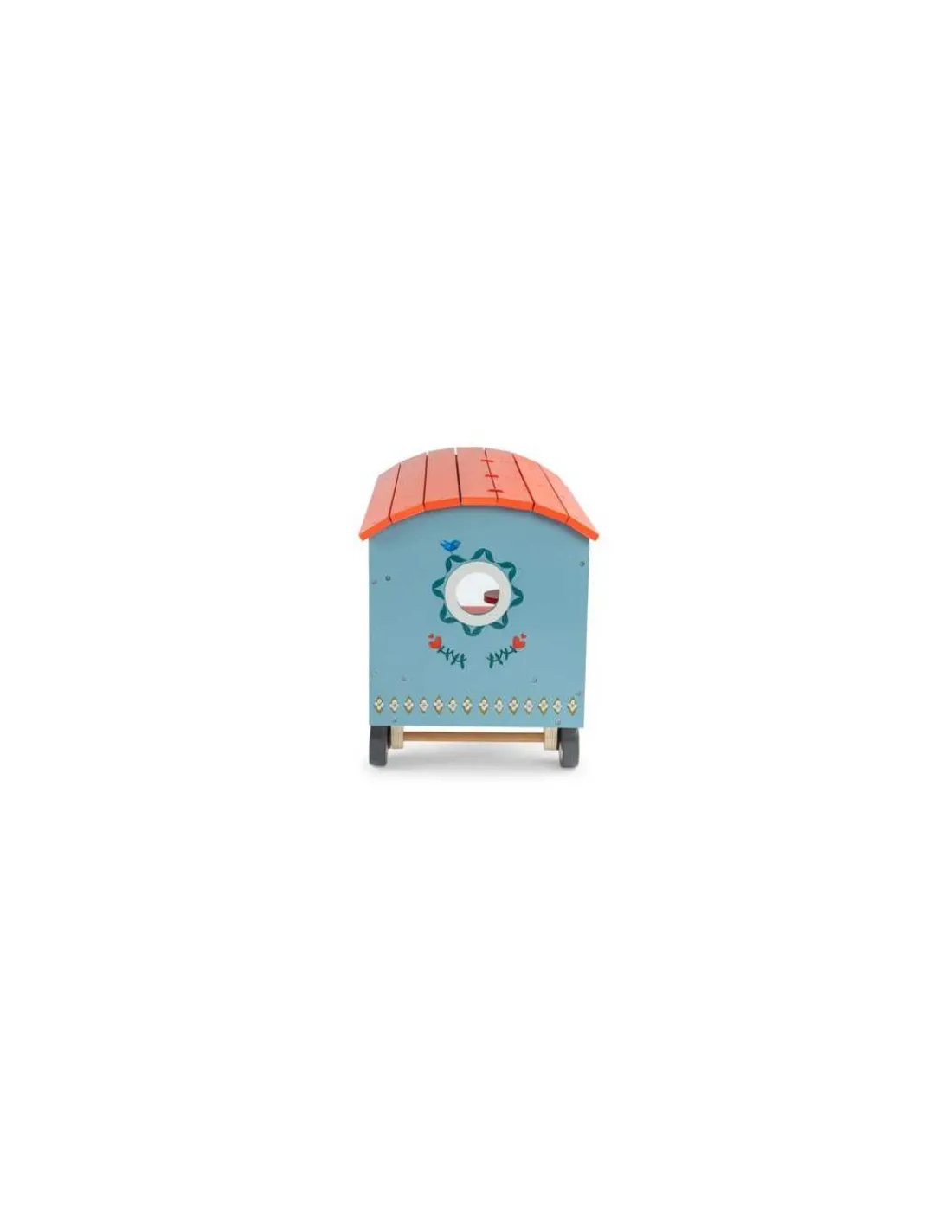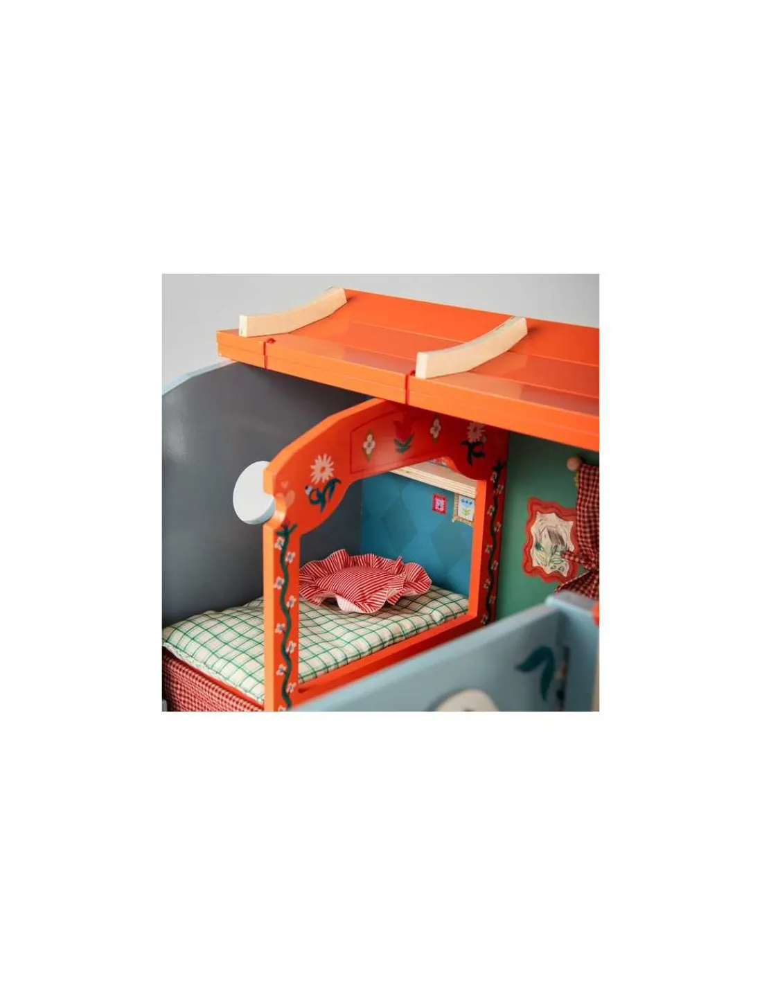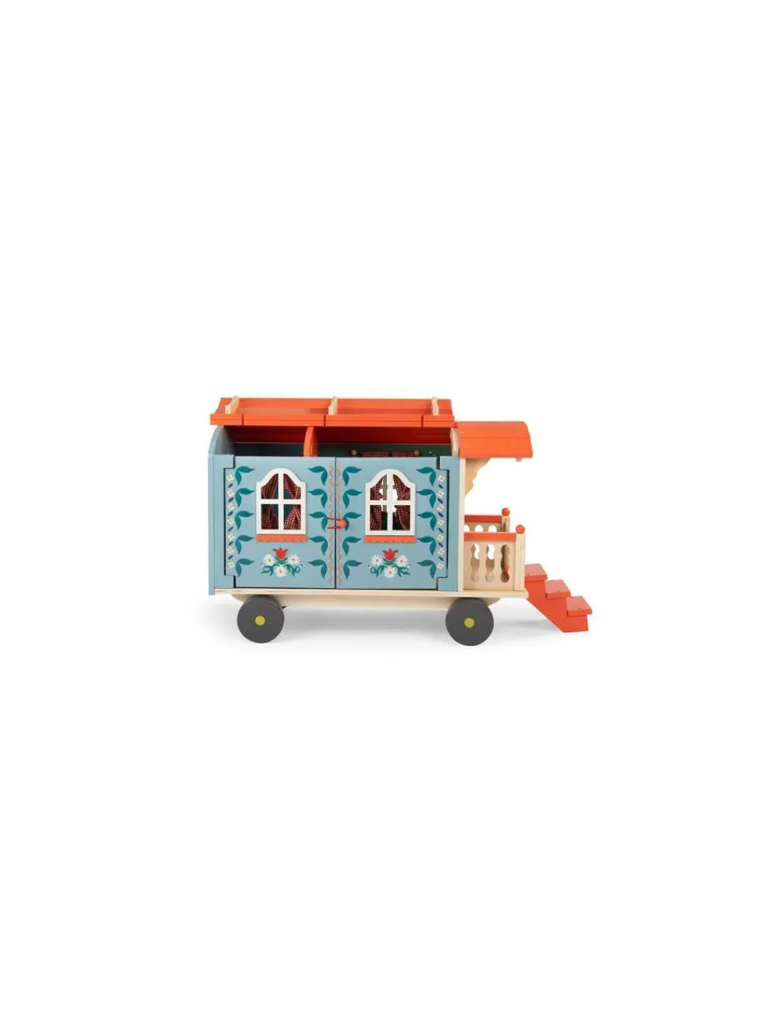 Découvrez la Roulotte en bois de la collection Les Minouchkas de Moulin Roty, une maison de poupée roulotte pour se raconter de belles histoires avec les poupées articulées Minouchkas à partir de 3 ans.