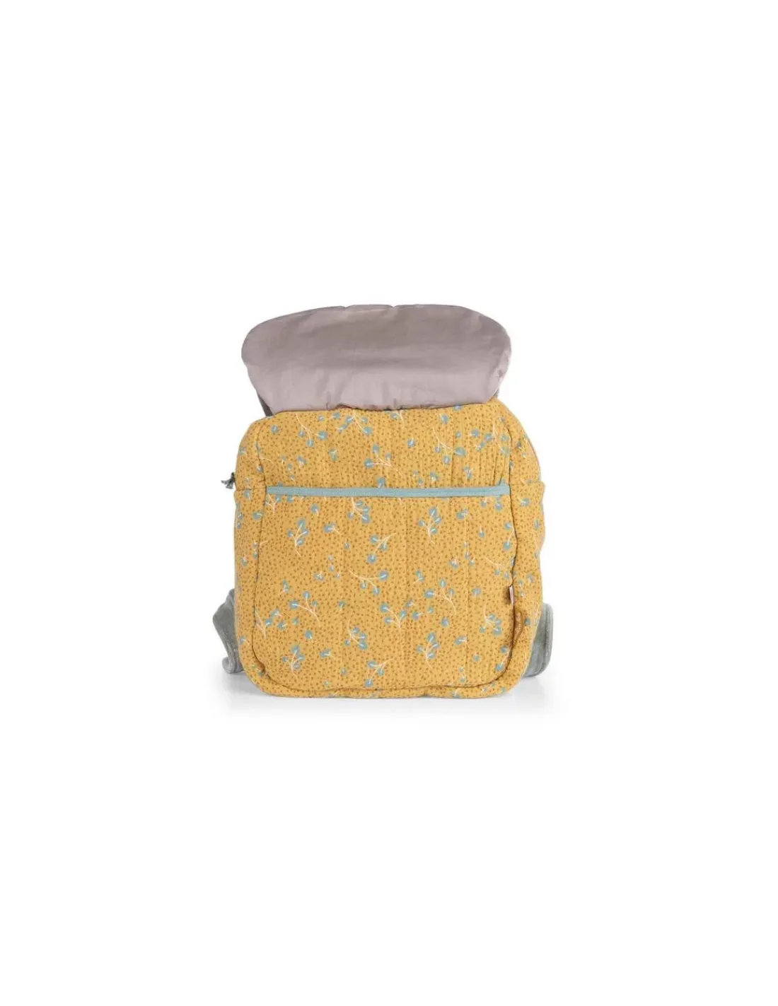 Découvrez le sac à dos lapin ocre de la collection Trois Petits Lapins de Moulin Roty, un sac en tissu tout doux qui accompagnera votre bébé en balade, chez la nounou ou à la crèche.