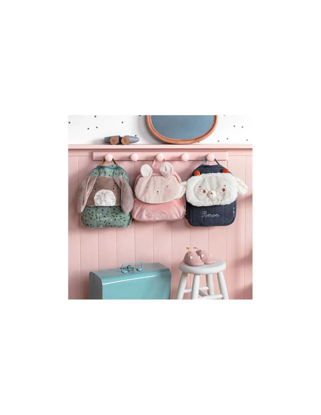Découvrez le sac à dos nuage mouton de la collection Après la pluie de Moulin Roty, un sac en lange de coton biologique et tissu chambray, avec son minois de mouton brodé et deux oreilles toutes douces en fourrure.