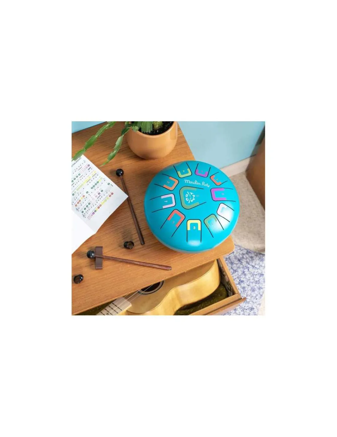 Un instrument à percussion aussi nommé Tongue Drum. Grâce à ses 11 notes, vous allez pouvoir jouer des mélodies relaxantes et envoutantes. Un instrument pour familiariser les enfants aux percussions. 11 notes indiquées par une couleur et un chiffre pour jouer avec les mains, le bout des doigts ou à l’aide de baguettes. Inclus sac de transport, livret de mélodies et 2 baguettes.