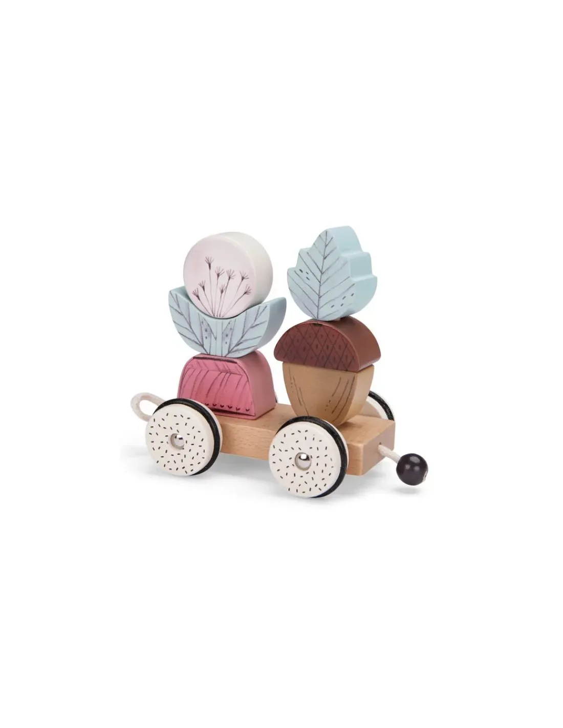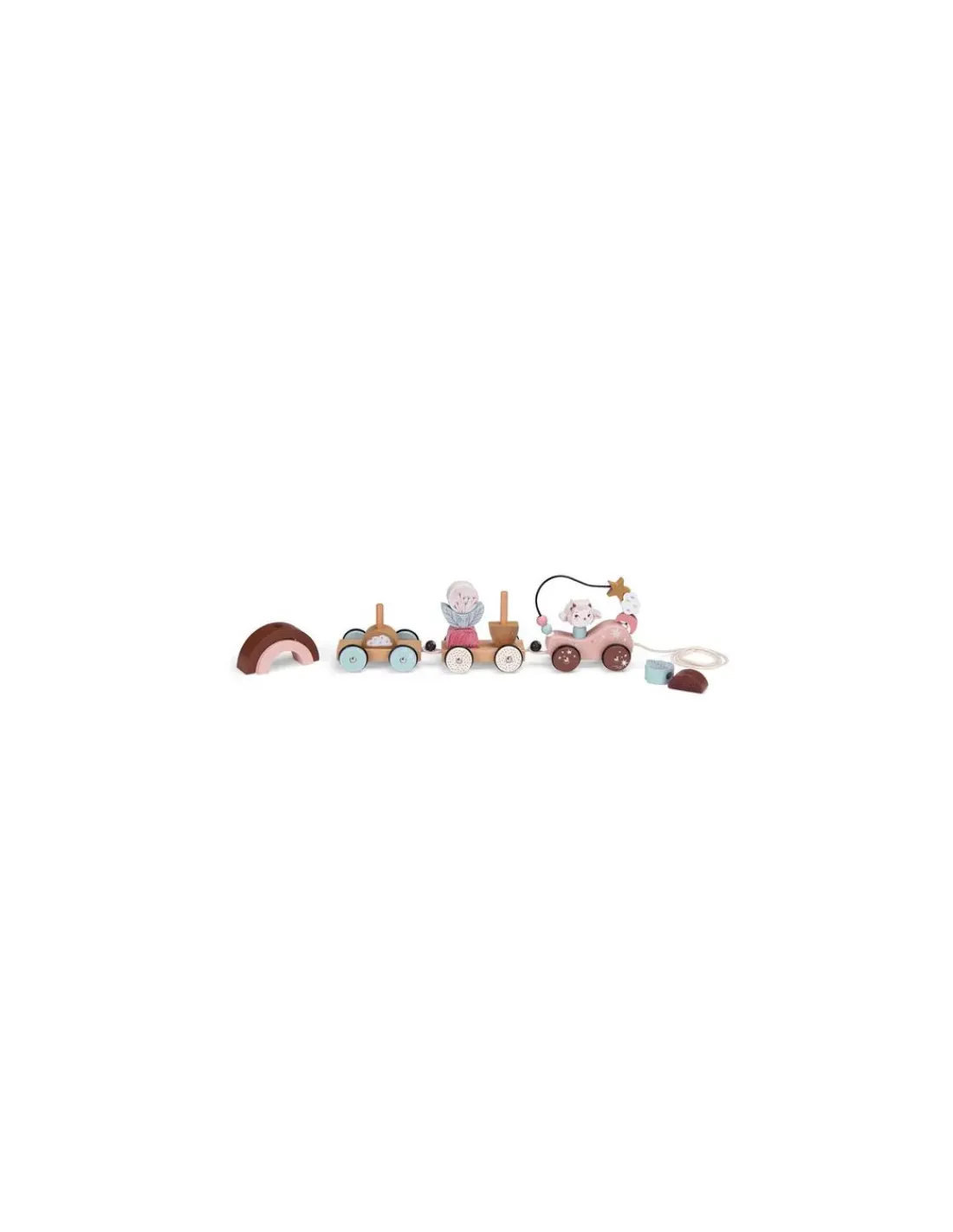 Un train d’activités en bois comprenant une locomotive et deux wagons détachables, sur lesquels bébé pourra reconstituer l’arc-en-ciel, la fleur… ou créer ses propres wagons en empilant les pièces. Un magnifique jouet d’éveil 2 en 1, à la fois empilable et jouet à tirer.