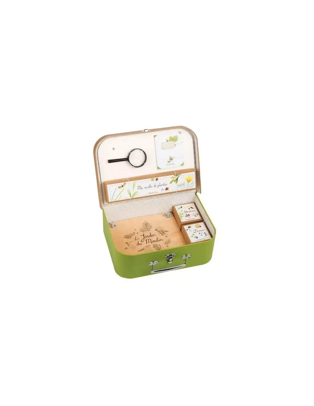 Découvrez la valise du botaniste de la collection Le jardin du Moulin de Moulin Roty, une valise illustrée pour observer la nature et faire sécher de jolies feuilles ou fleurs.