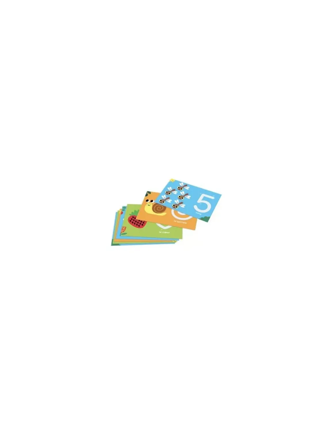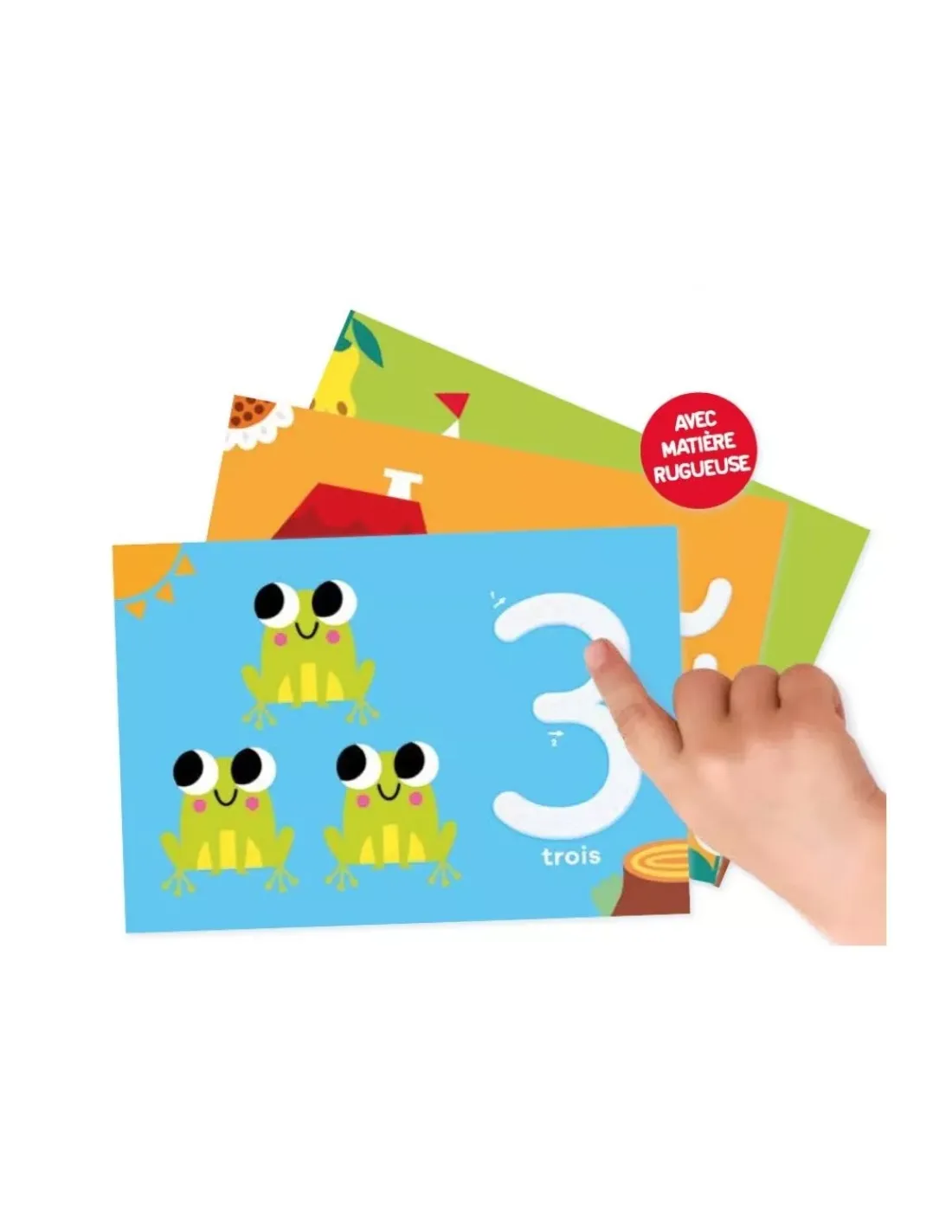 De grandes cartes magnifiquement illustrées avec un tracé rugueux à suivre avec le doigt. « Un petit oiseau posé sur la branche, deux sauterelles sautent dans le pré, trois grenouilles nagent dans la mare… »