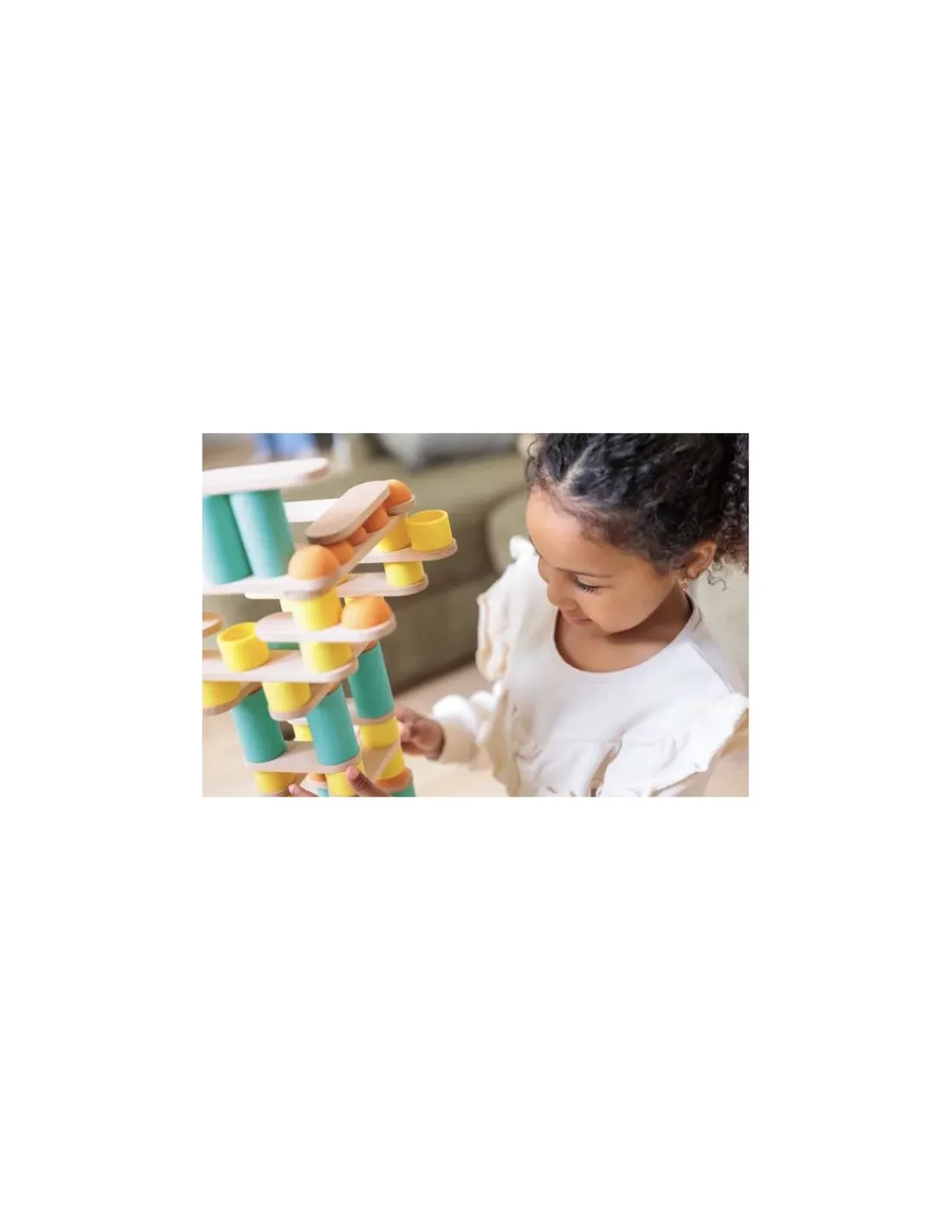 Le coffret contient 108 pièces: 36 tubes en silicone, 36 demi sphère en silicone, 36 planchettes en hêtre, un livret d’instructions avec des exemples de créations et un sac en coton naturel.