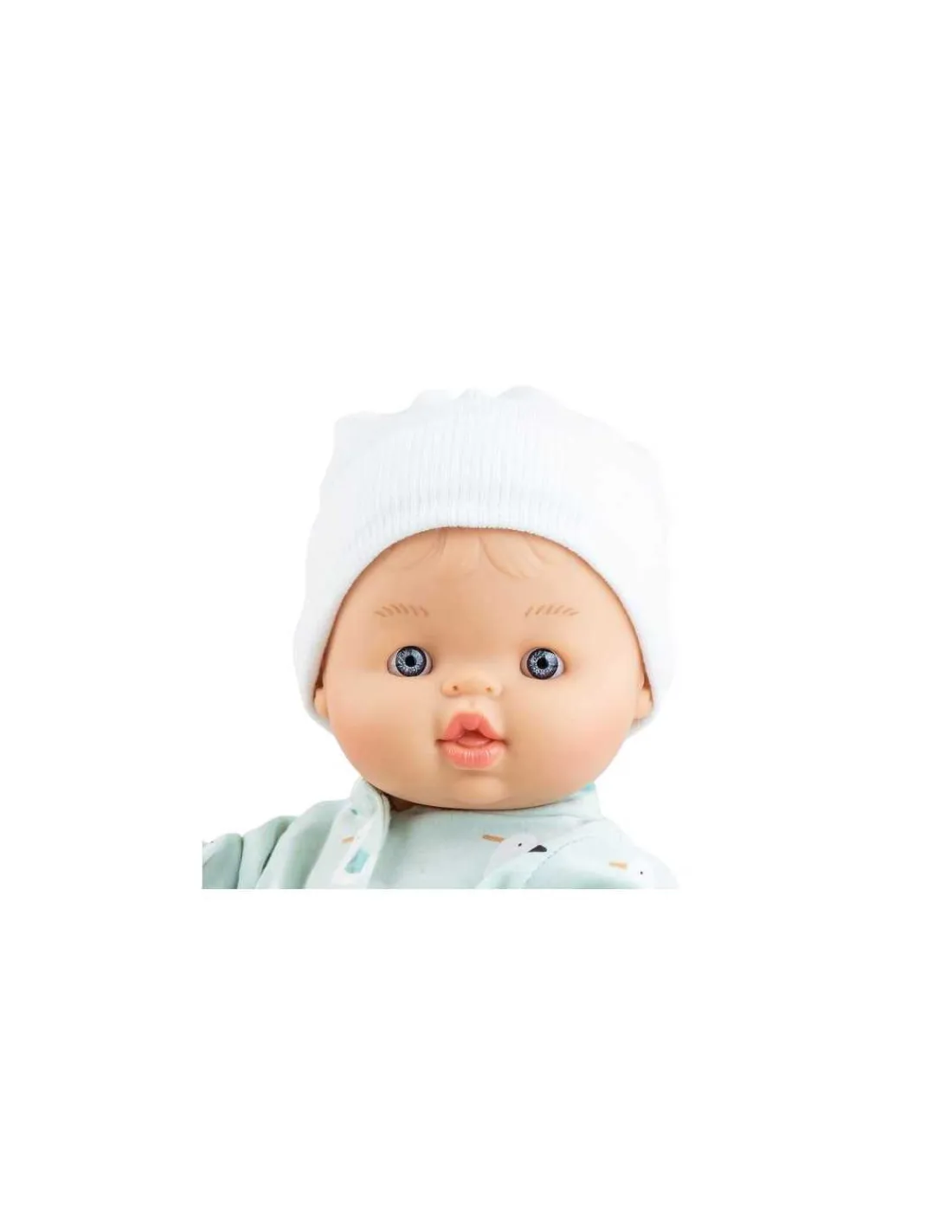 Une poupée en vinyle à la douce senteur de vanille sans cheveux. Bruno a un visage très expressif et des yeux bleus. Il est habillé d’un adorable pyjama et coiffé d’un bonnet blanc.