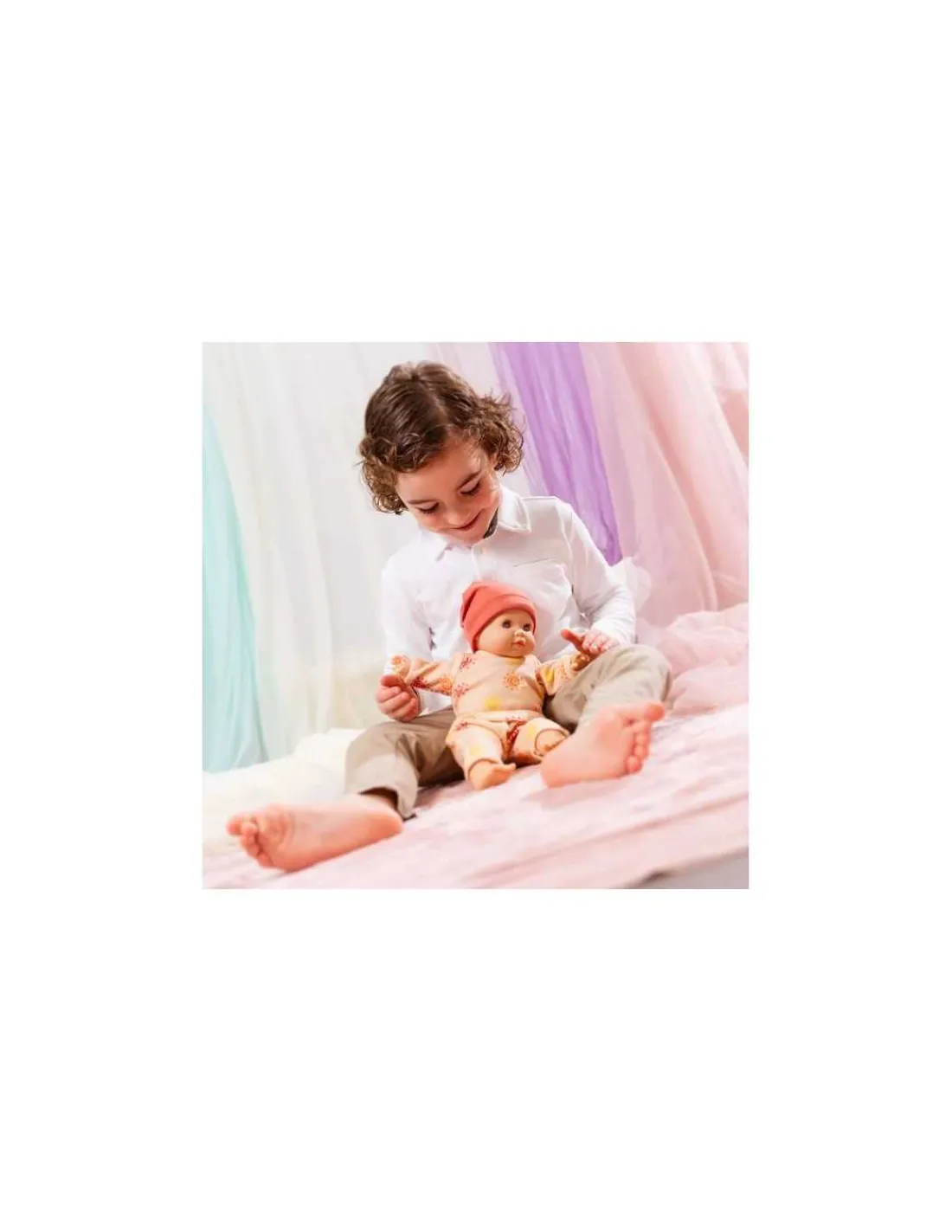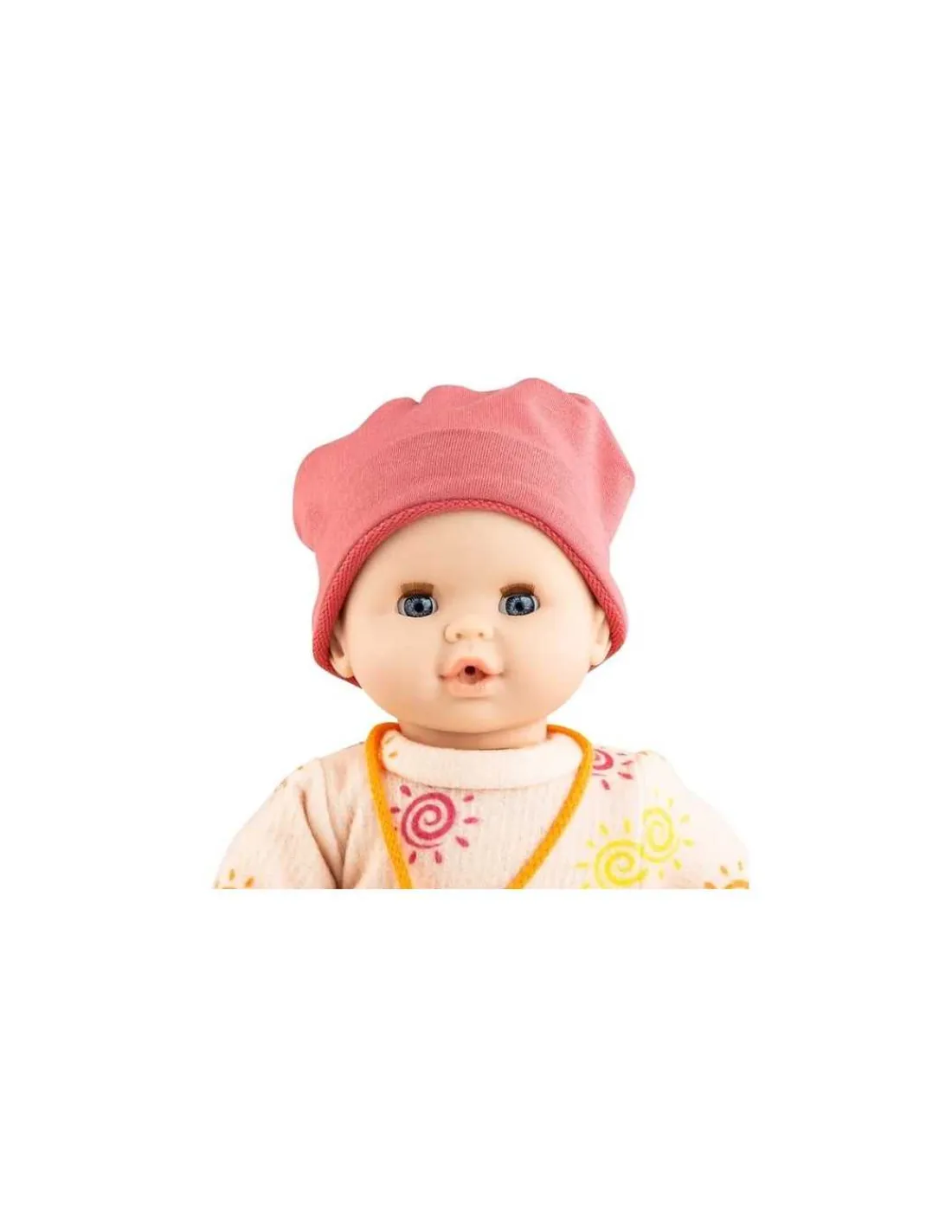 Une poupée au corps souple avec les membres et la tête en vinyle à la douce senteur de vanille sans cheveux. Une poupée non sexuée qui pleure lorsqu’elle n’a pas sa tétine et qui dit papa et maman. Une poupée idéale pour jouer au papa et à la maman qu’il faudra câliner.