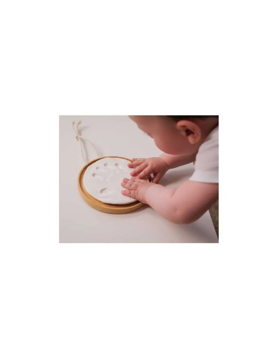 Le coffret comprend de la pâte hypoallergénique, un rouleau pour application, un cadre rond en bois pour ornement, un cordon pour le suspendre ainsi qu’un descriptif pour créer facilement l’empreinte.