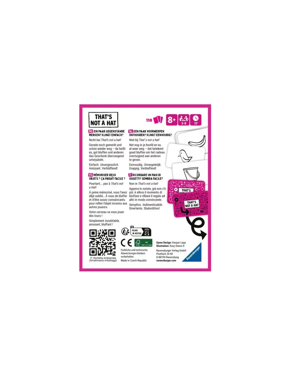 Découvrez le jeu That’s not a hat de Ravensburger, un jeu de Bluff et un jeu de Memory pour jouer de 3 à 8 joueurs à partir de 8 ans. Un petit format à emporter partout pour des parties rapides, fun et instantanées.
