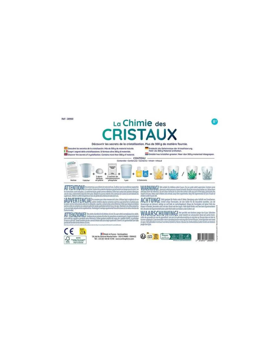 Le coffret comprend 2 sachets de poudre à cristaux de 120g, 2 supports pour faciliter la cristallisation, 1 bécher, 1 pot de cristallisation, 2 colorants et 1 notice.