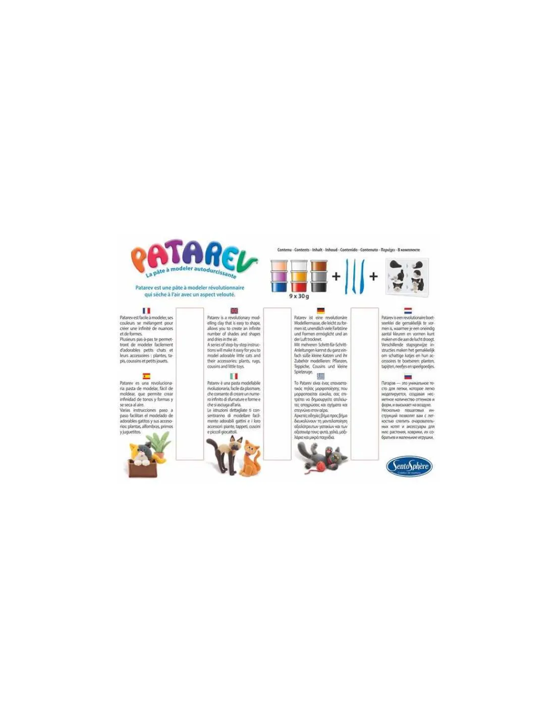 Le coffret comprend 9 pots de Patarev de 30 g chacun (couleurs : chocolat, marron, jaune d’or, rouge, vert, chair, pourpre, blanc et noir), 3 outils de modelage et une notice pas-à-pas avec 10 réalisations.