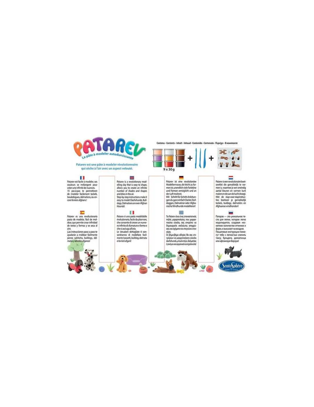 Le coffret comprend 9 pots de Patarev de 30 g chacun (couleurs : chocolat, marron, jaune d’or, rouge, vert, chair, pourpre, blanc et noir), 3 outils de modelage et une notice pas-à-pas avec 10 réalisations.