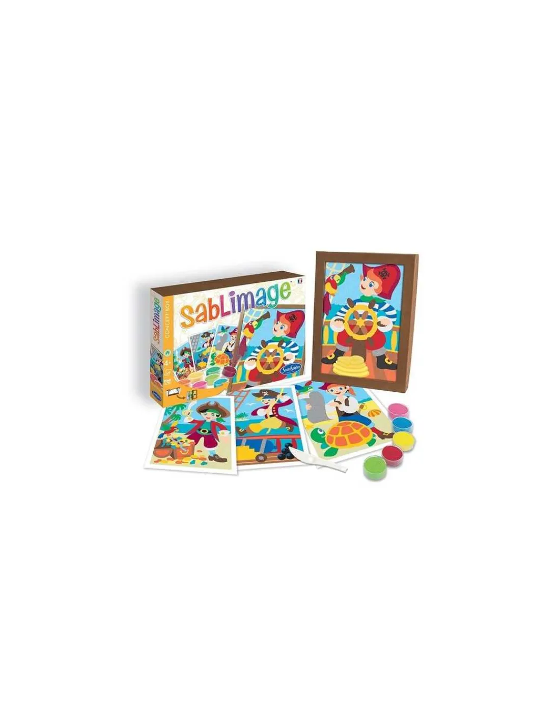 Découvrez le coffret Sablimage pirates de Sentosphère, un coffret de sables colorés pour les enfants à partir de 4 ans, 4 tableaux à réaliser sur le thème des pirates.