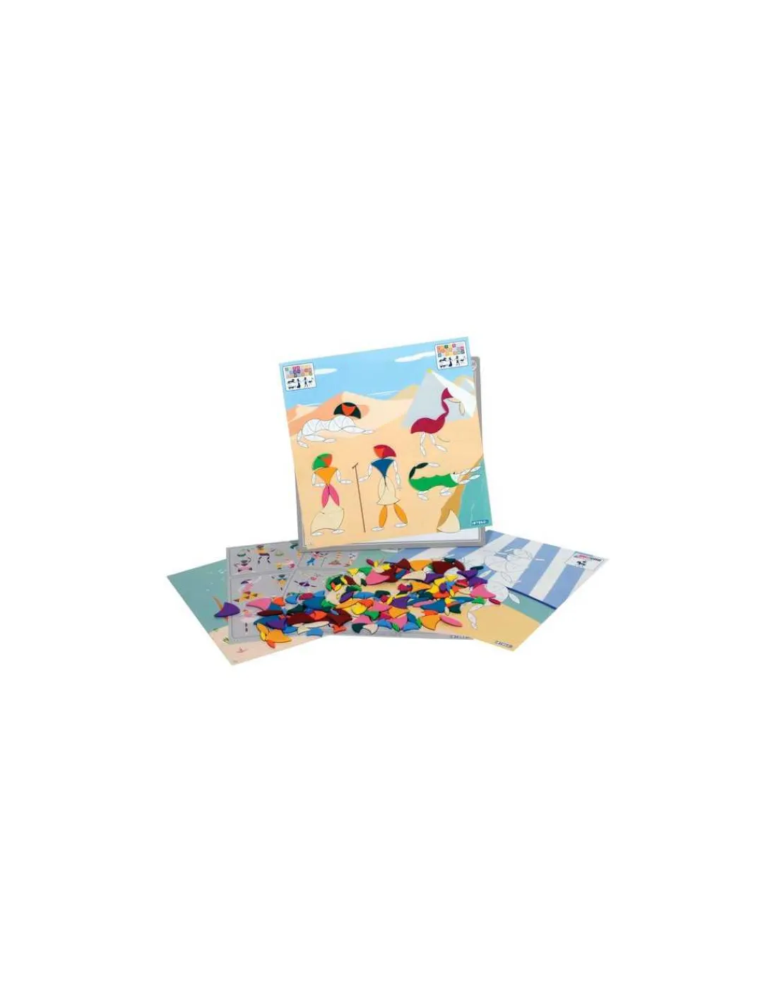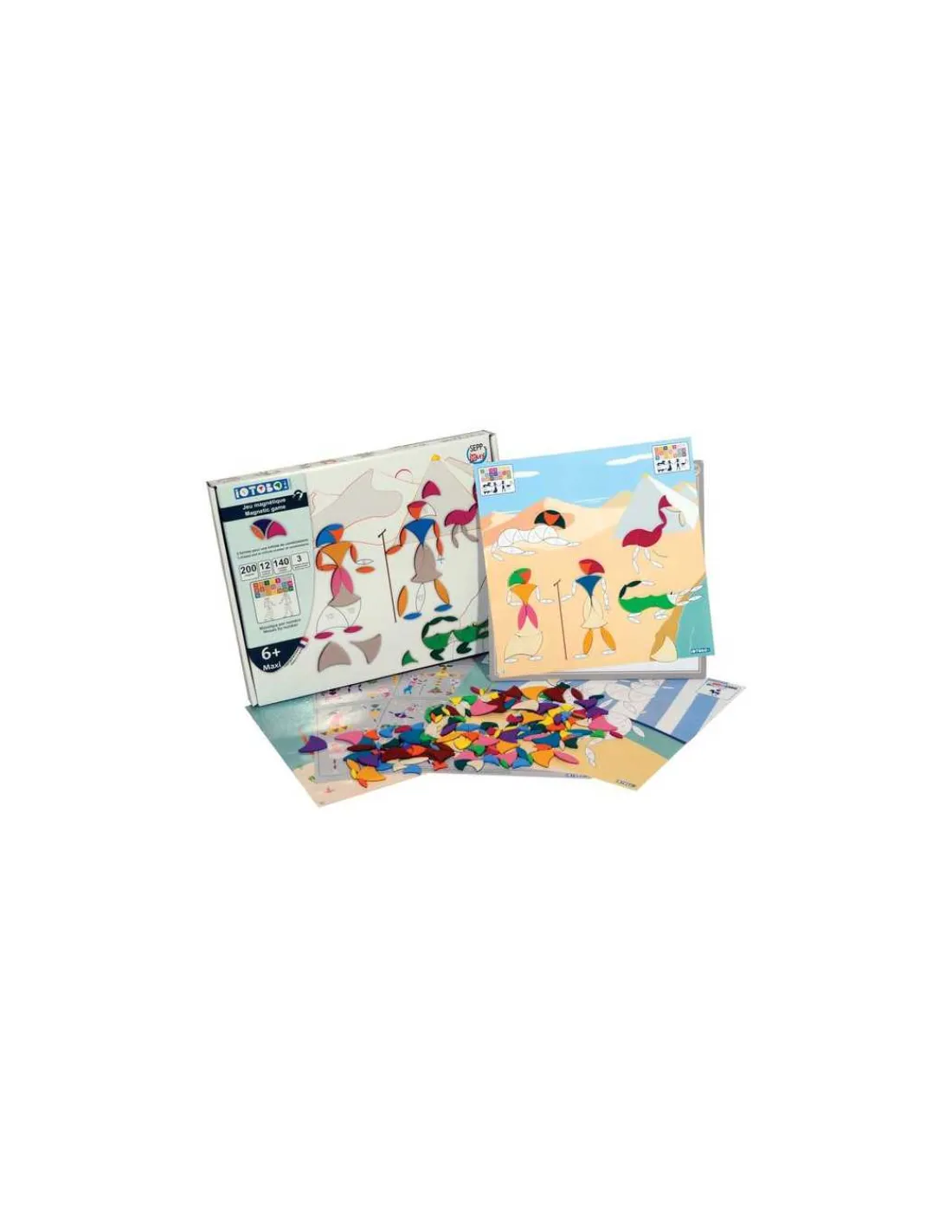 Le coffret comprend un tableau magnétique, 200 magnets en mousse de 2 tailles différentes (12 couleurs) et 140 modèles avec 3 niveaux de jeu.