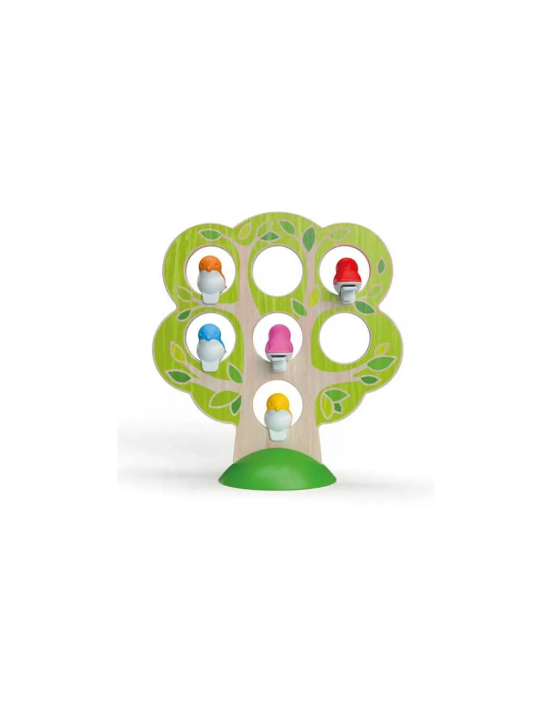 La boite de jeu contient 1 arbre en bois et son socle, 5 pinces « oiseau », 1 livret de 60 défis et leur solution et la règle de jeu.