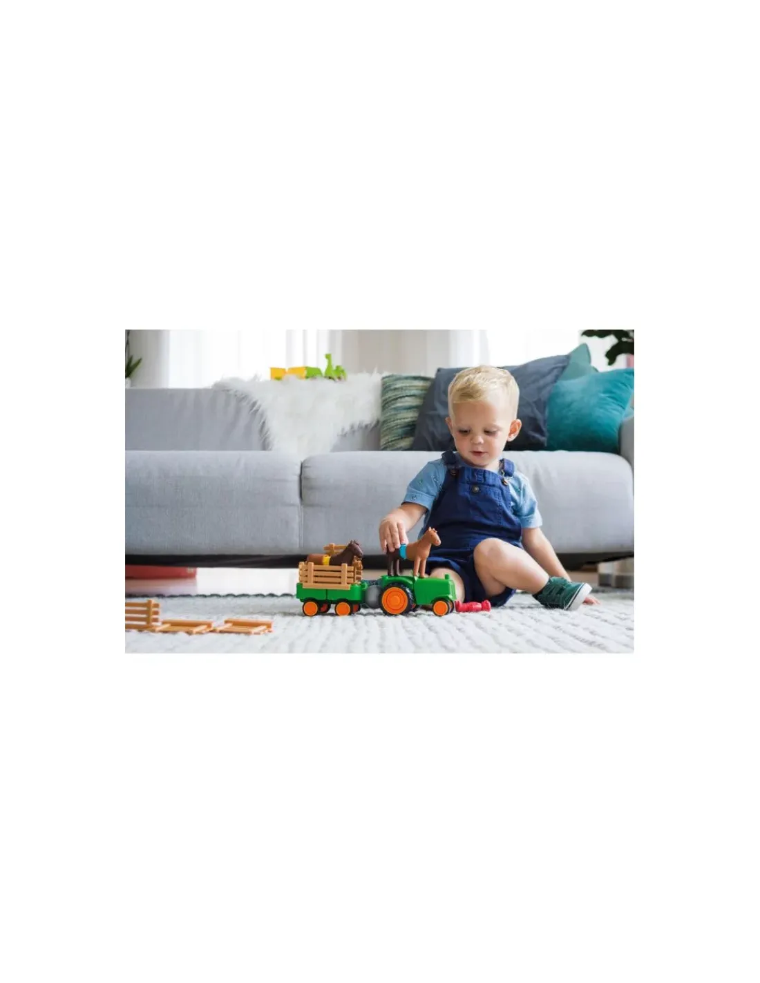 Ce coffret contient 22 pièces de jeu : 2 têtes d’animaux, 2 queues d’animaux, 2 grands bâtonnets, 2 petits bâtonnets, 1 boule, 1 personnage, 2 petites barrières, 6 grandes barrières et 4 pièces permettant de réaliser le tracteur et sa remorque.