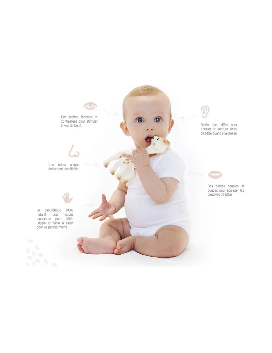 Sophie la girafe attire le regard de bébé grâce à ses tâches foncées sur tout le corps et devient un jouet familier et rassurant de son quotidien. Doté d’un sifflet, il amuse et stimule l’ouïe de votre enfant quand il le presse. Souple et avec de nombreuses parties à mordiller (oreilles, pattes…), il est idéal pour soulager les gencives de bébé lorsqu’il fait ses premières dents.