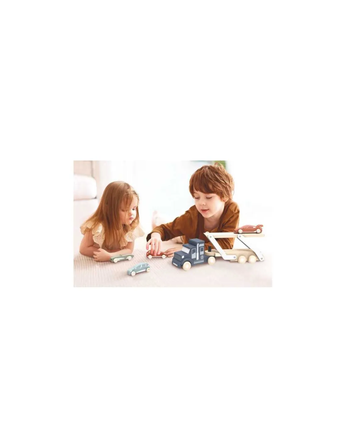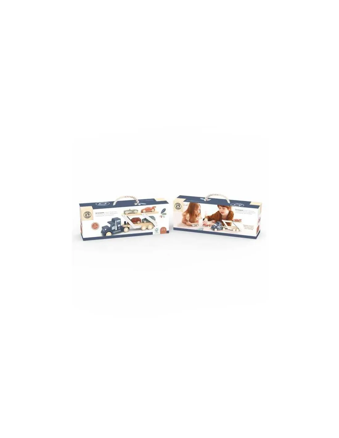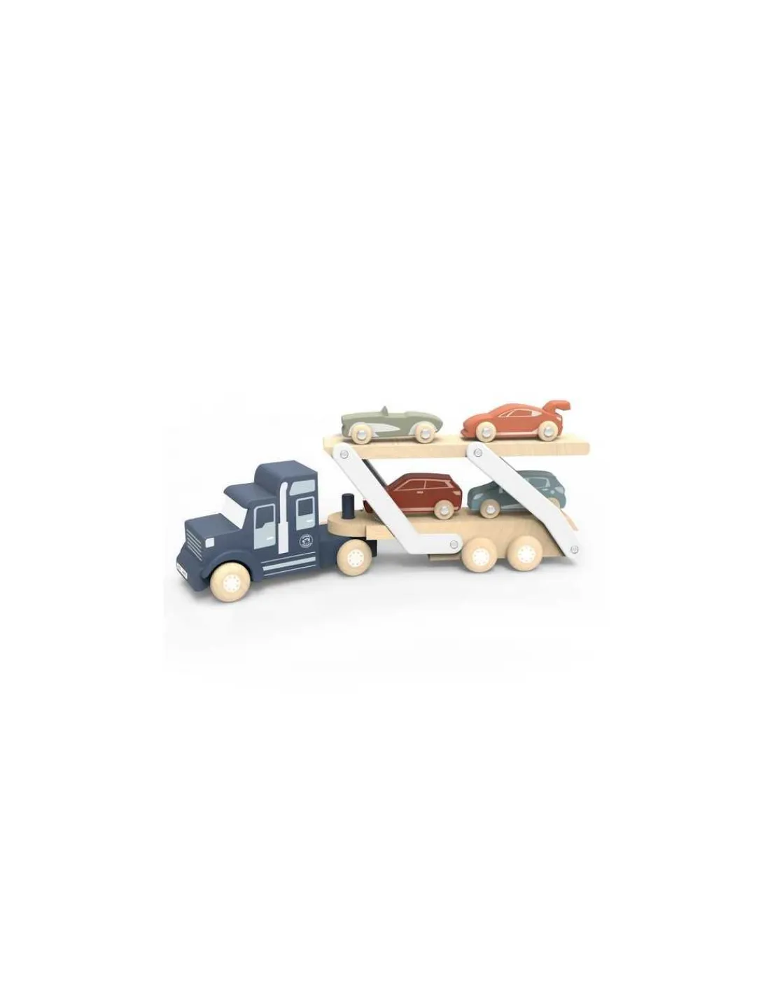 Ce jouet en bois comprend un camion transporteur avec une remorque à double niveau, facilement convertible pour le chargement et le déchargement. Quatre modèles de petites voitures en bois colorées sont incluses et des emplacements spécifiques sur la remorque empêchent les voitures de tomber.