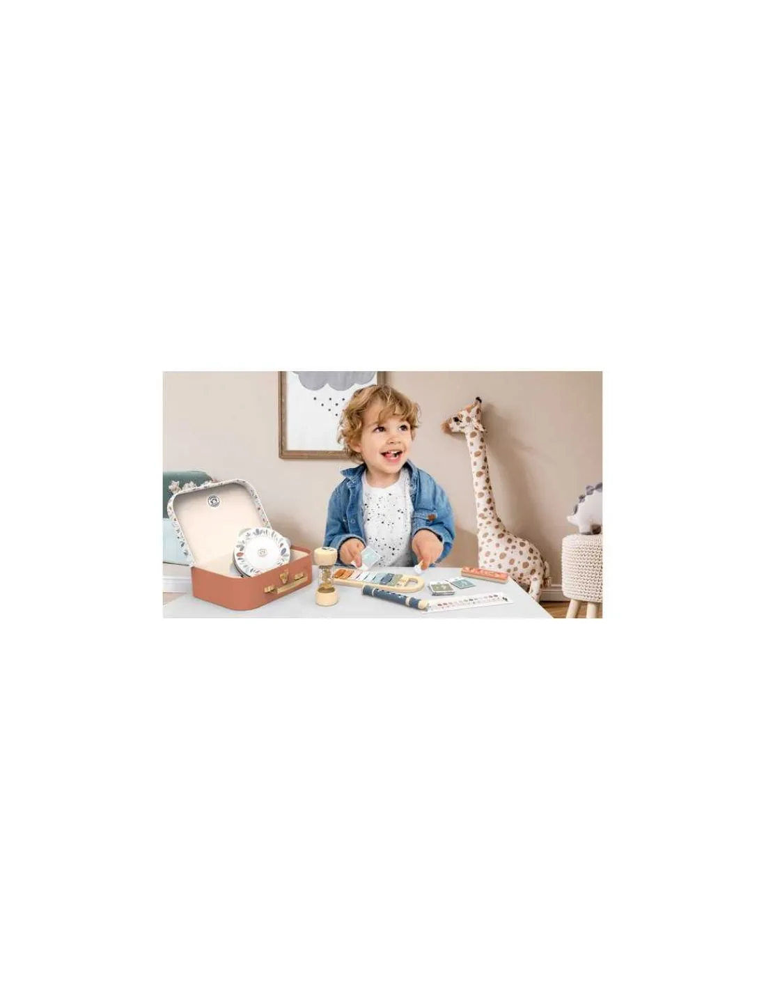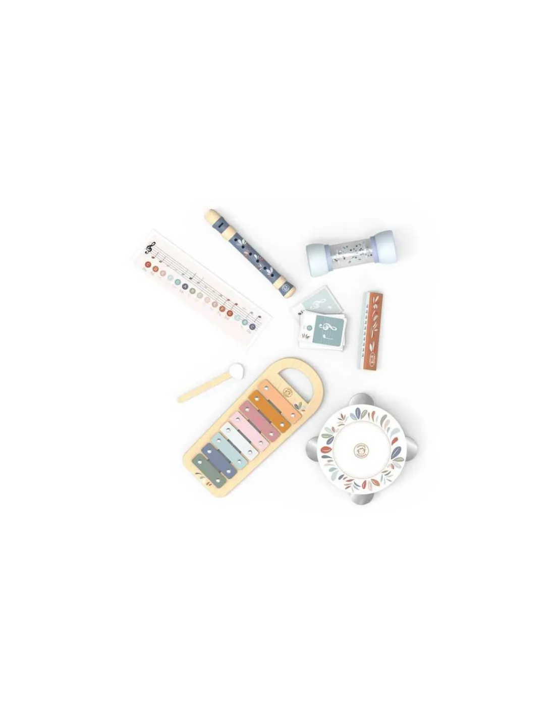 Cette valisette musicale inclut cinq instruments pour découvrir le plaisir de la musique : un xylophone coloré, un tambourin doux, un bâton de pluie, une flûte et un harmonica. Chaque instrument aide à développer la coordination, les compétences sensorielles et l’aptitude musicale des enfants.